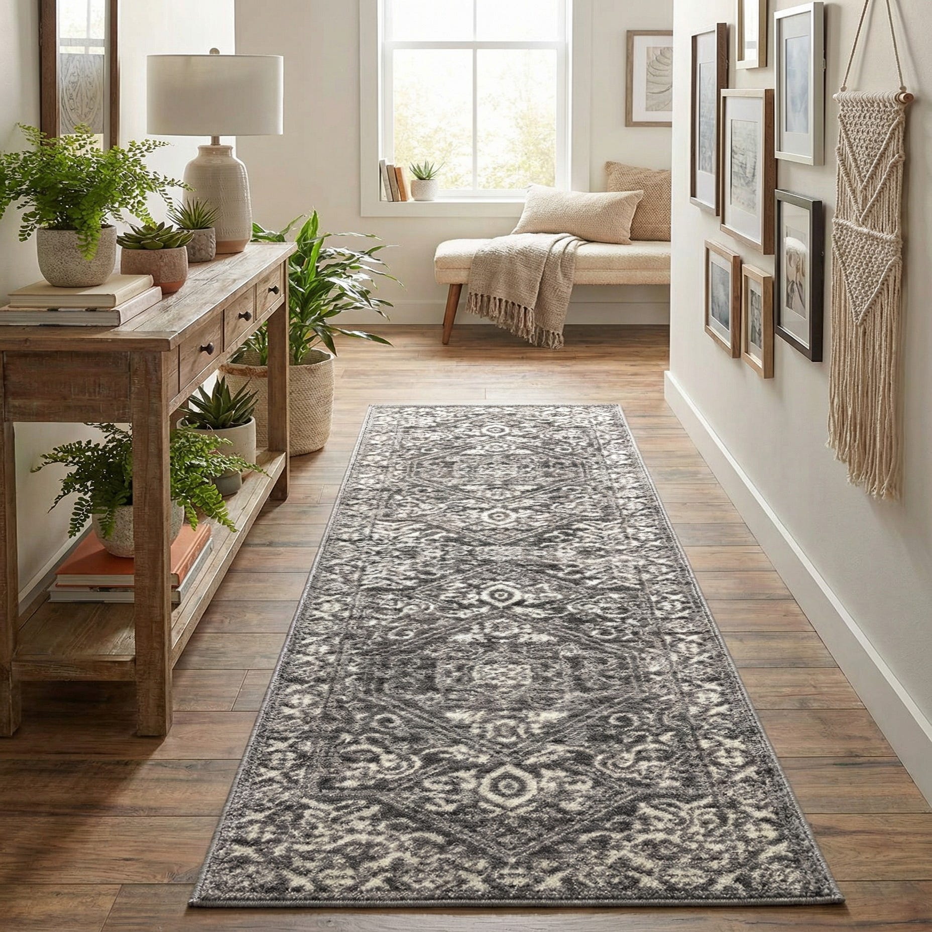 This narrow runner is ideal for hallways, entryways, kitchen galleries, or along the side of a bed where you want to add pattern and warmth without bold color. Its neutral gray and ivory palette pairs easily with light or dark wood floors, painted millwork, and both matte and metallic finishes, making it suited to transitional, modern farmhouse, Scandinavian, or contemporary interiors.