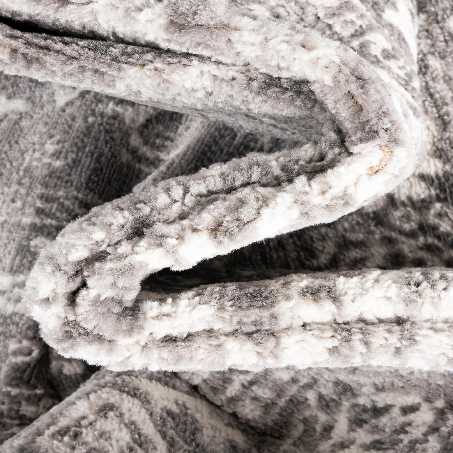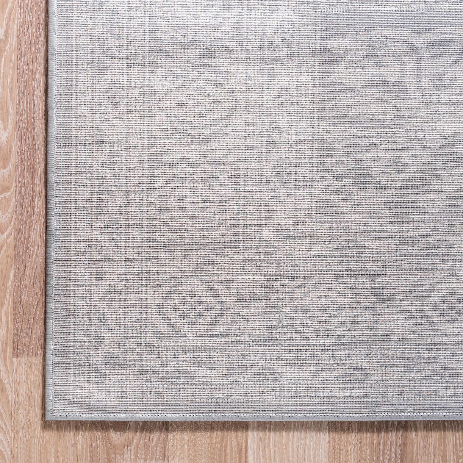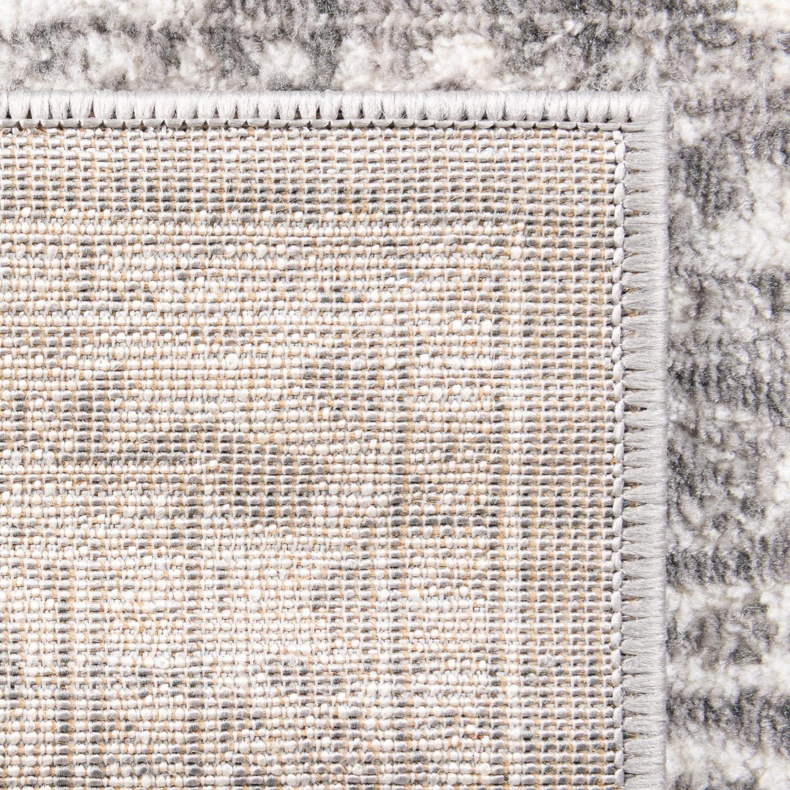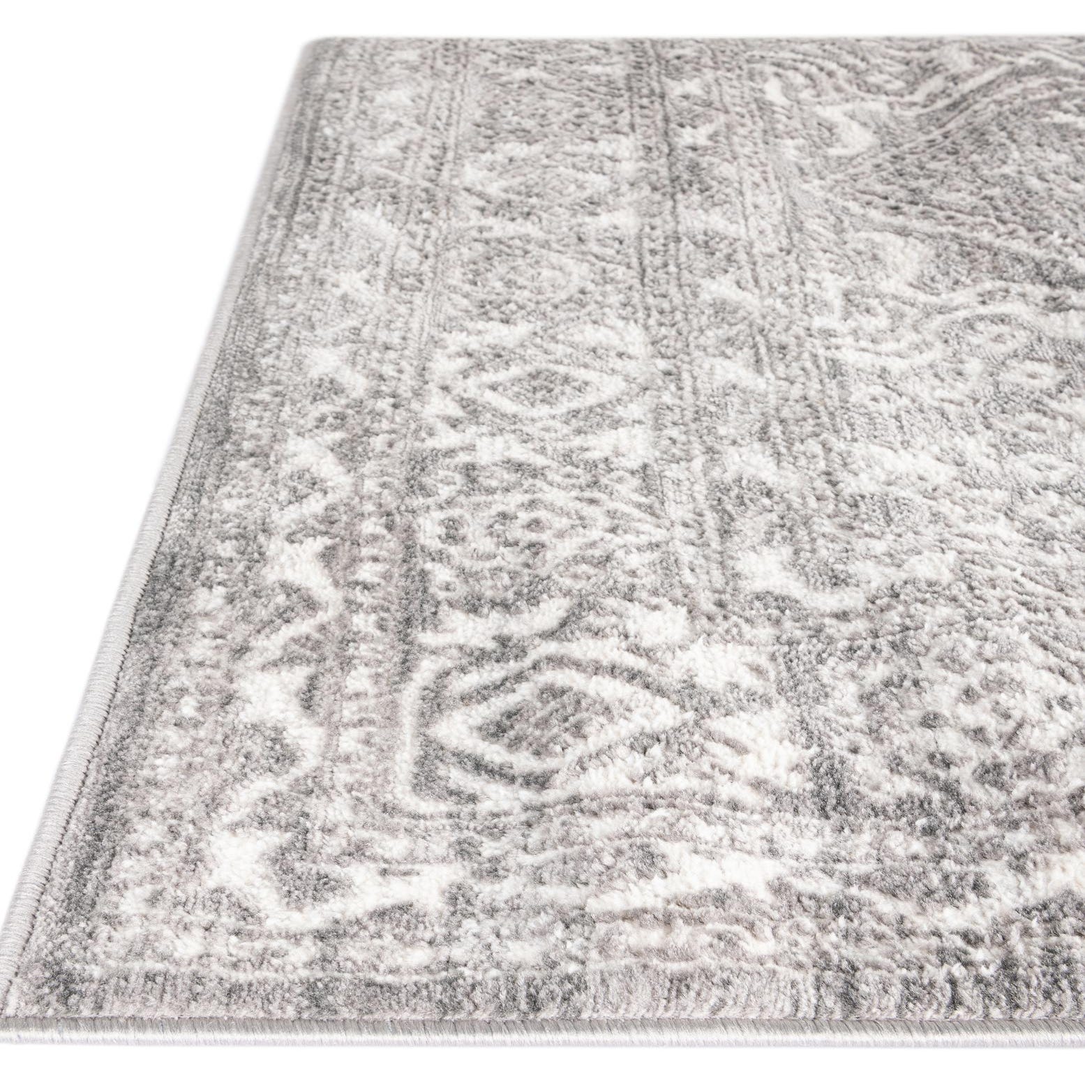 A softly weathered medallion pattern sits on a gray background, with ivory scrolling and floral motifs that create a balanced, low-contrast look. The design has a vintage-inspired character with gently blurred edges that add depth without overpowering a space. Machine-made from 55% polypropylene and 45% polyester, the pile is low-to-medium and feels smooth and slightly brushed underfoot, with polyester highlights that give a subtle luster to the pattern.