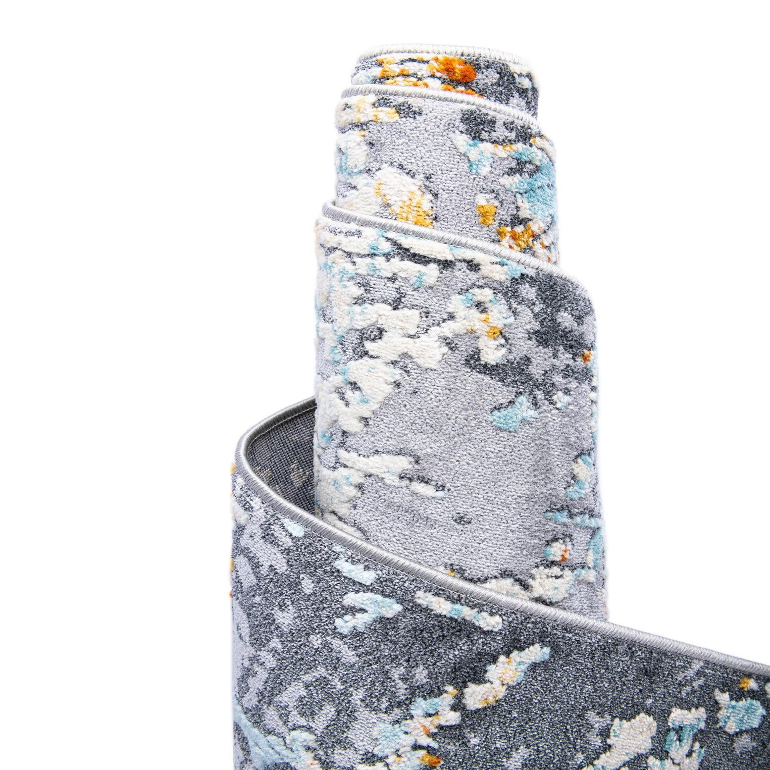 A painterly, abstract pattern spreads across a gray field, punctuated by streaks of gold, light blue, teal, terracotta, tan and ivory. The distressed, layered design mixes broken linear marks and mottled color washes for an artful, lived-in look. Machine-made from 70% polypropylene and 30% polyester, the pile has a soft, slightly plush hand with subtle height variation that creates a tactile, textured surface and a soft, low-profile sheen.