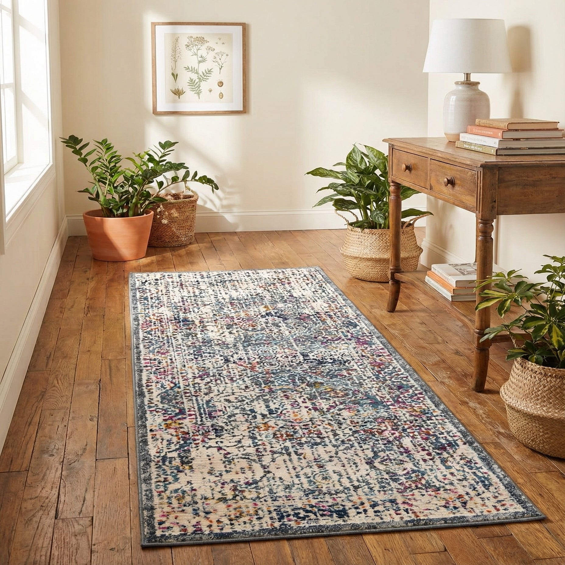 This runner is suited to narrow footprints—hallways, entryways, and alongside kitchen islands or beds—where its mix of neutral gray and colorful accents can anchor a traffic path and tie together other finishes. It pairs easily with navy or ivory upholstery, warm wood tones and brass or gold accents, and complements transitional, modern farmhouse or eclectic interiors that benefit from a layered, lived-in look.
