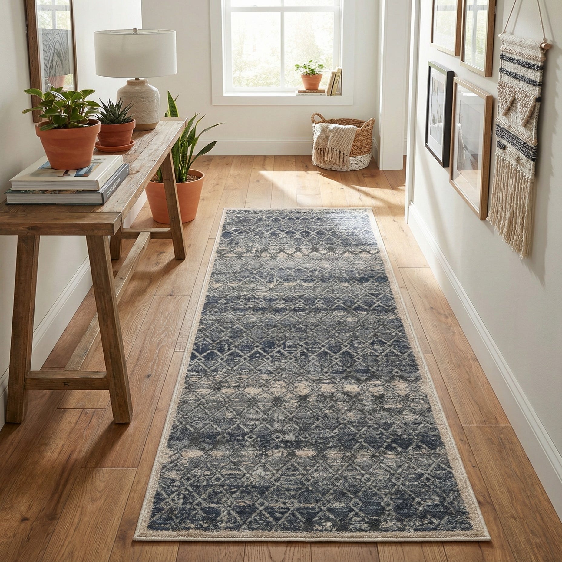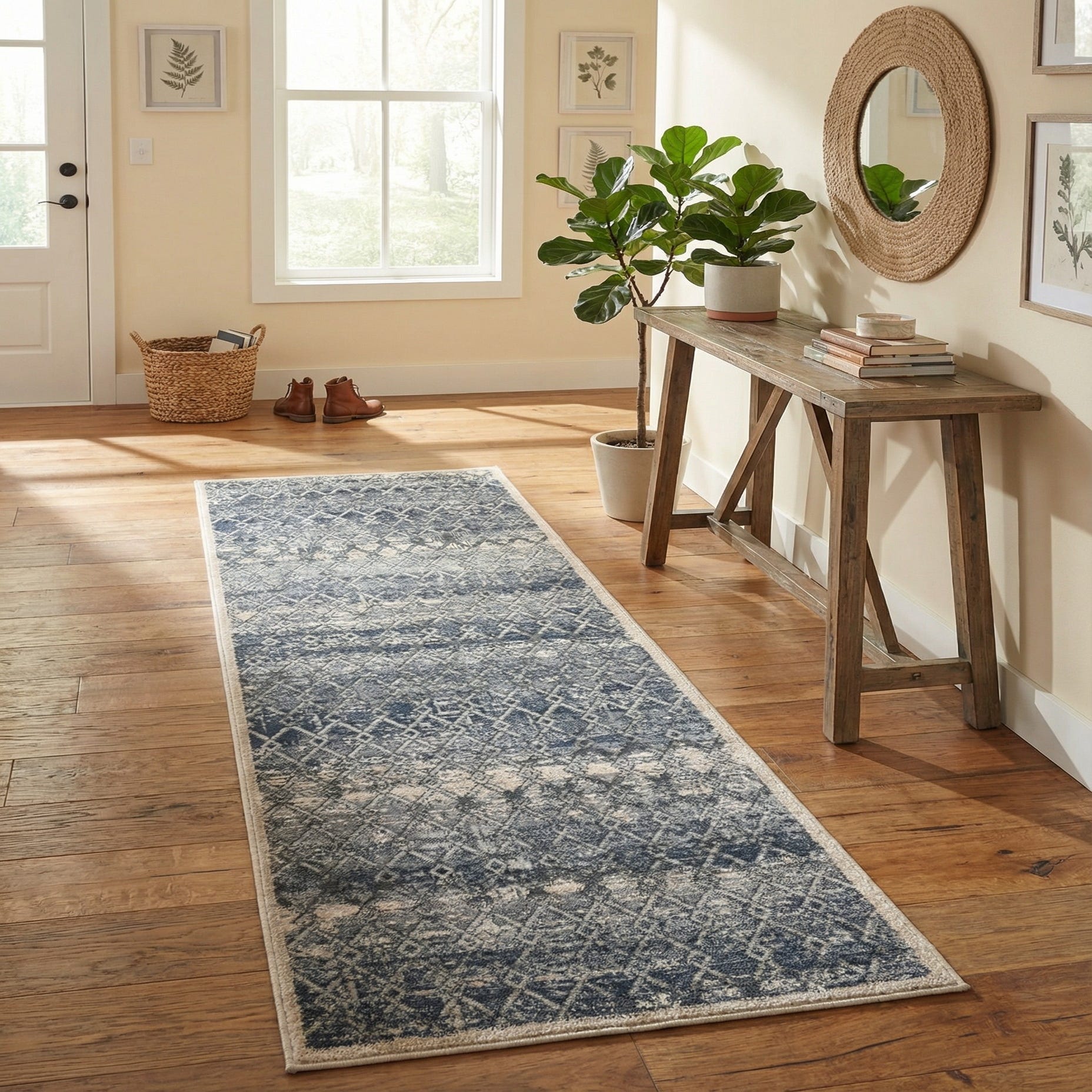 Ideal for narrow spaces, the runner works well in hallways, entryways, alongside a bed, or in a galley kitchen. It pairs naturally with pale or weathered wood floors and navy or cream upholstery for a coastal or relaxed traditional look, and it also complements modern schemes with metal accents and cool-gray walls. Use it to introduce pattern and soft color without overwhelming a room’s existing palette.