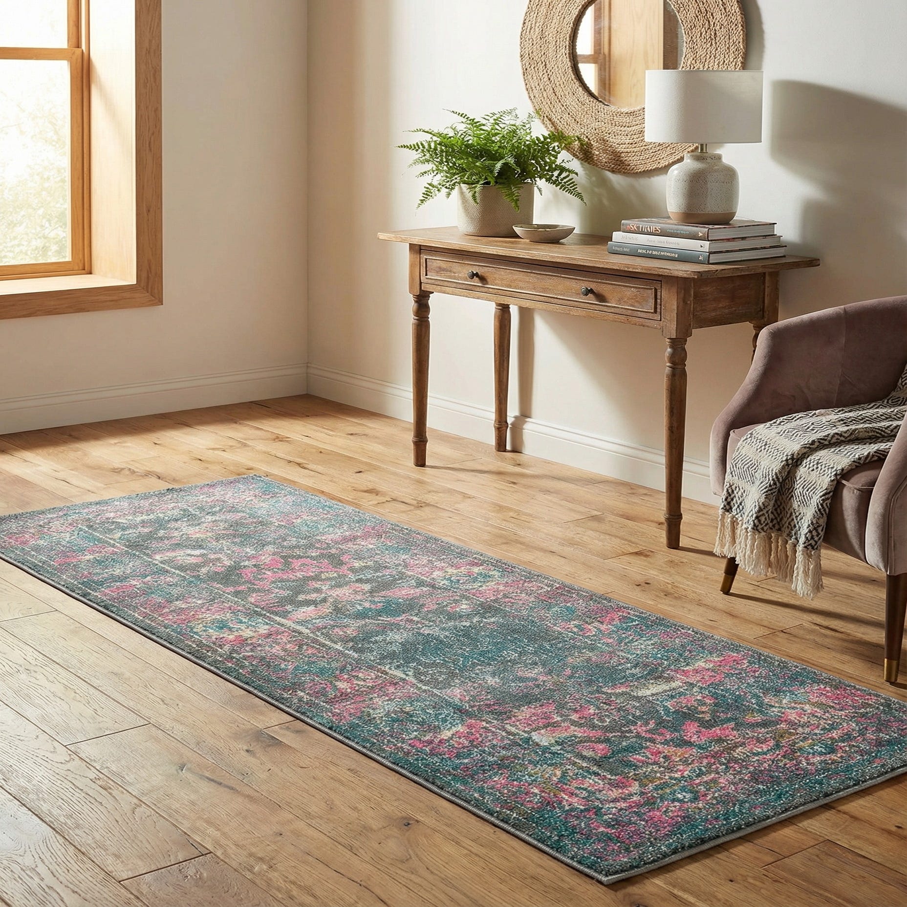 Place this runner in a hallway or entry to introduce color and pattern, or alongside a bed or sofa to anchor a layered, lived-in look. It suits transitional, eclectic, or bohemian interiors—pair with warm wood tones and brass or aged-metal accents to bring out the gold and silver highlights, or add blush and teal textiles to echo the salmon and blue. The pattern and color mix also work well in contemporary spaces that need a touch of warmth and personality.