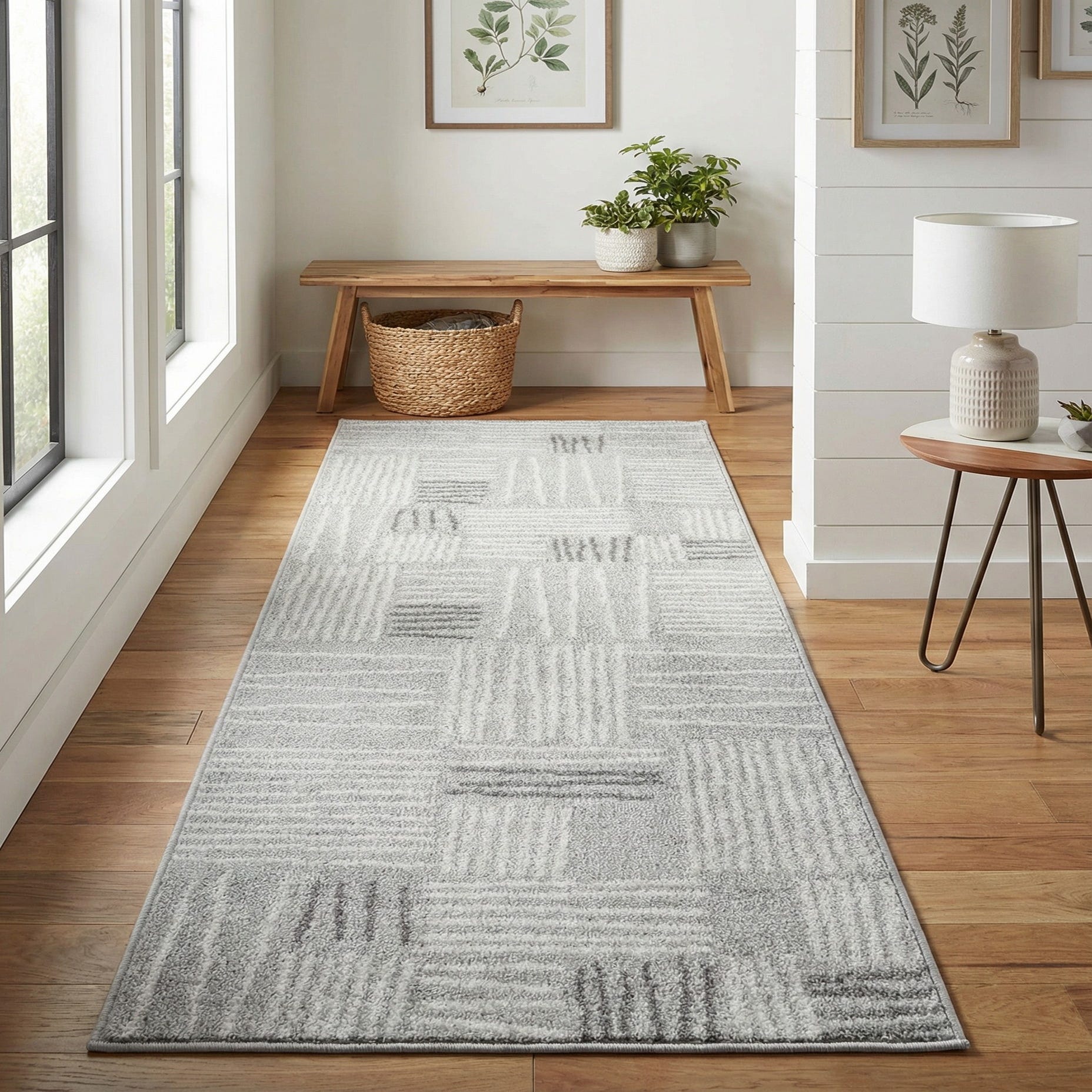 This runner works well to define a narrow hallway or entry corridor, where the linear pattern enhances movement through the space. It pairs naturally with cool-toned palettes and light wood flooring, and complements contemporary, Scandinavian, or transitional interiors. It also functions as a bedside runner or kitchen walkway when you want a neutral base that adds texture without overwhelming other design elements.
