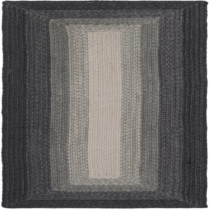A 6 ft runner rug featuring a modern braided wool design with an ombre stripe pattern in varying shades of gray, from dark charcoal to light silver.