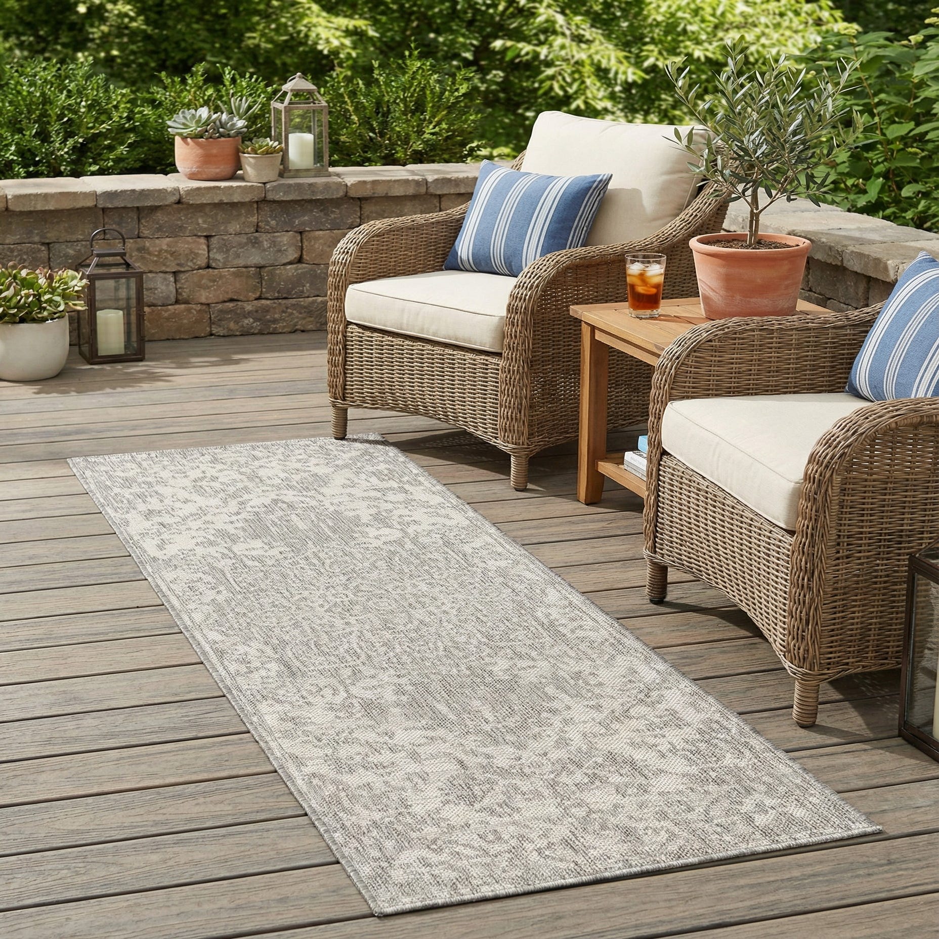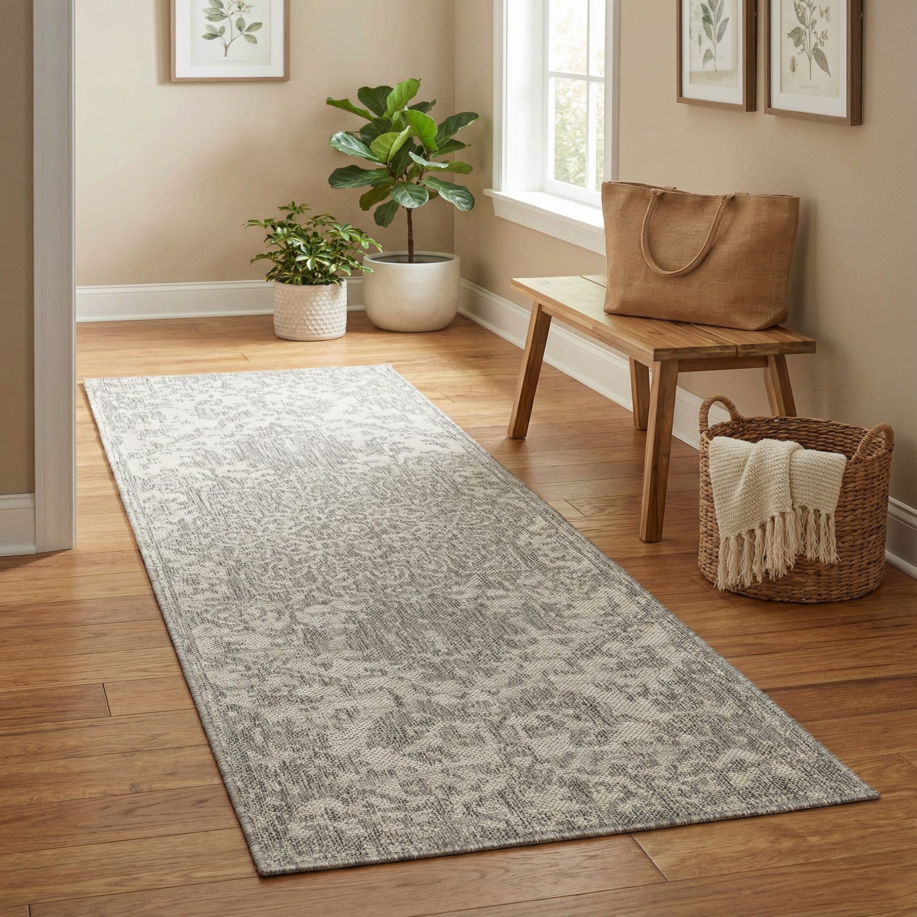 This runner is well-suited to transitional and modern interiors as well as coastal or Scandinavian-inspired schemes where a neutral palette is preferred. Use it in a hallway or entry, in front of a kitchen sink, or on a covered porch to complement light wood tones, woven seating, and metal accents. Its muted gray and ivory coloring makes it easy to layer with patterned cushions or solid furnishings while maintaining a calm, cohesive look.
