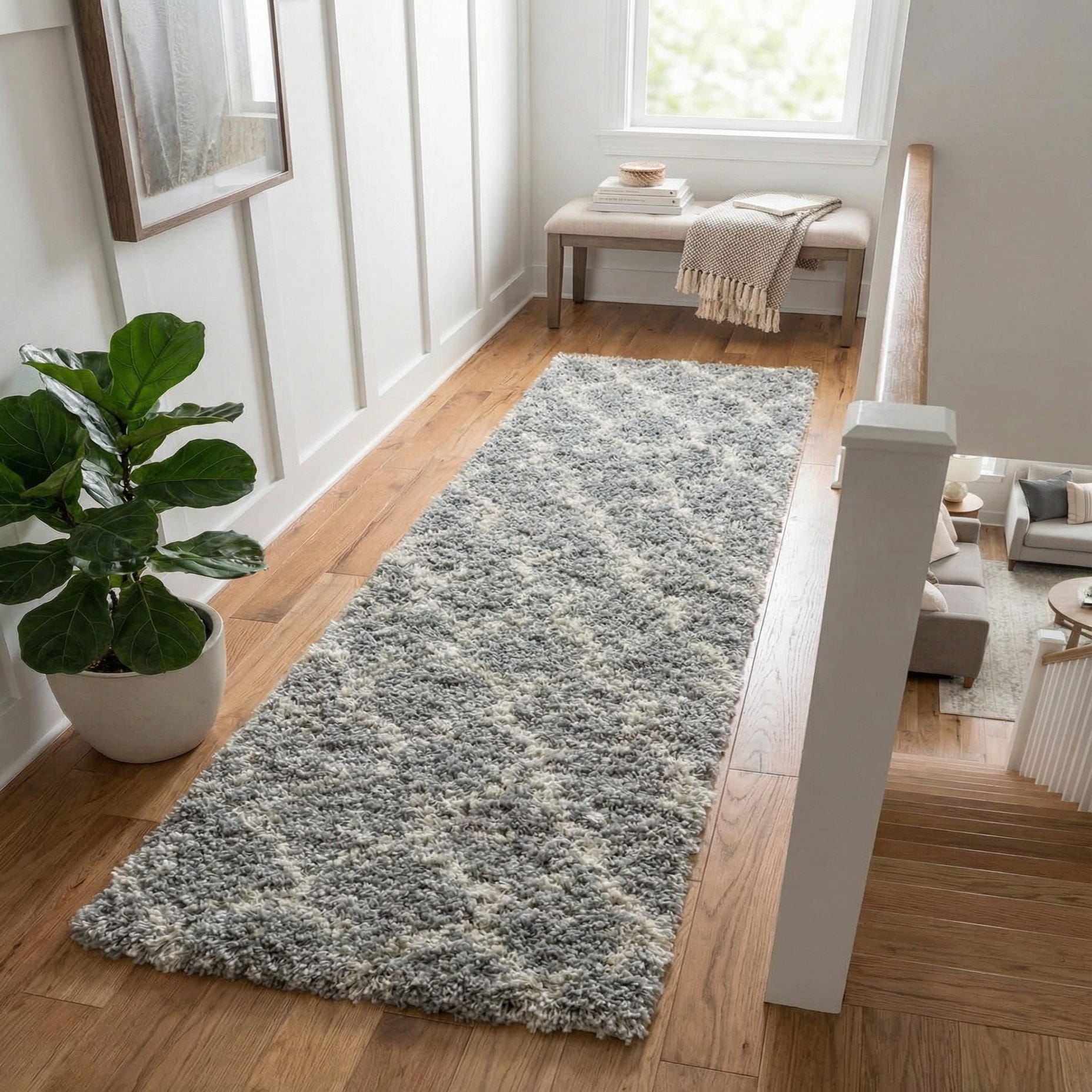 A 6 ft gray runner rug with a modern high/low textured shag pile and an abstract white lattice pattern.