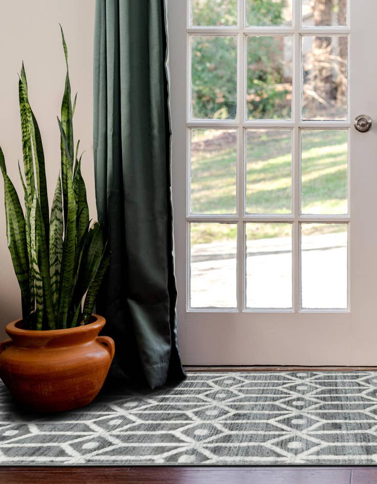 A 6 ft runner rug with a gray background and a repeating off-white geometric trellis pattern, ideal for a hallway.