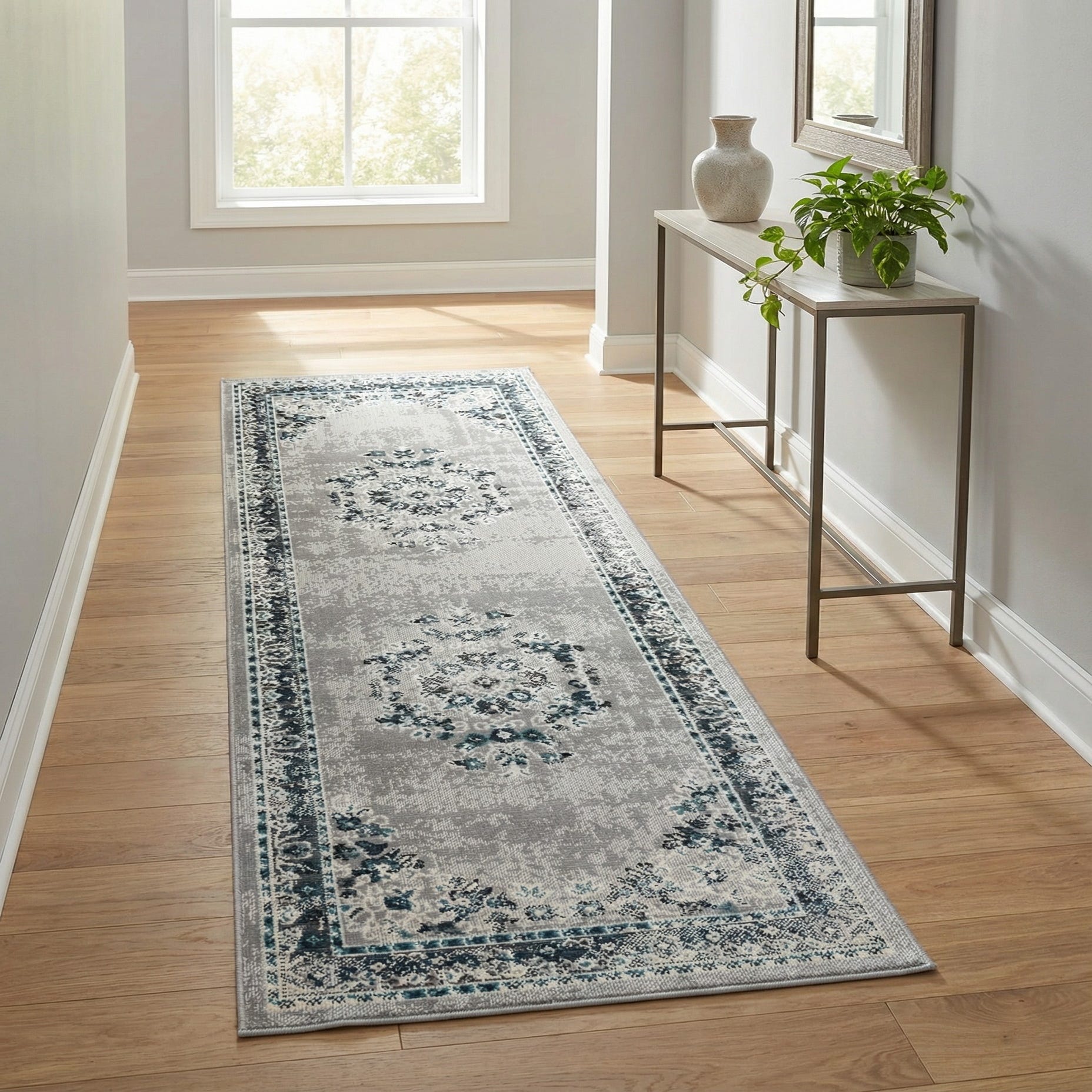 A soft gray ground anchors a faded, vintage-inspired medallion pattern in shades of blue and ivory. Two repeating floral medallions run along the runner’s length, framed by a narrow, ornamental border that mixes tiny floral motifs with subtle geometric detailing. The overall effect is gently distressed, with layered color washes that give the design depth without heavy pile or texture changes.