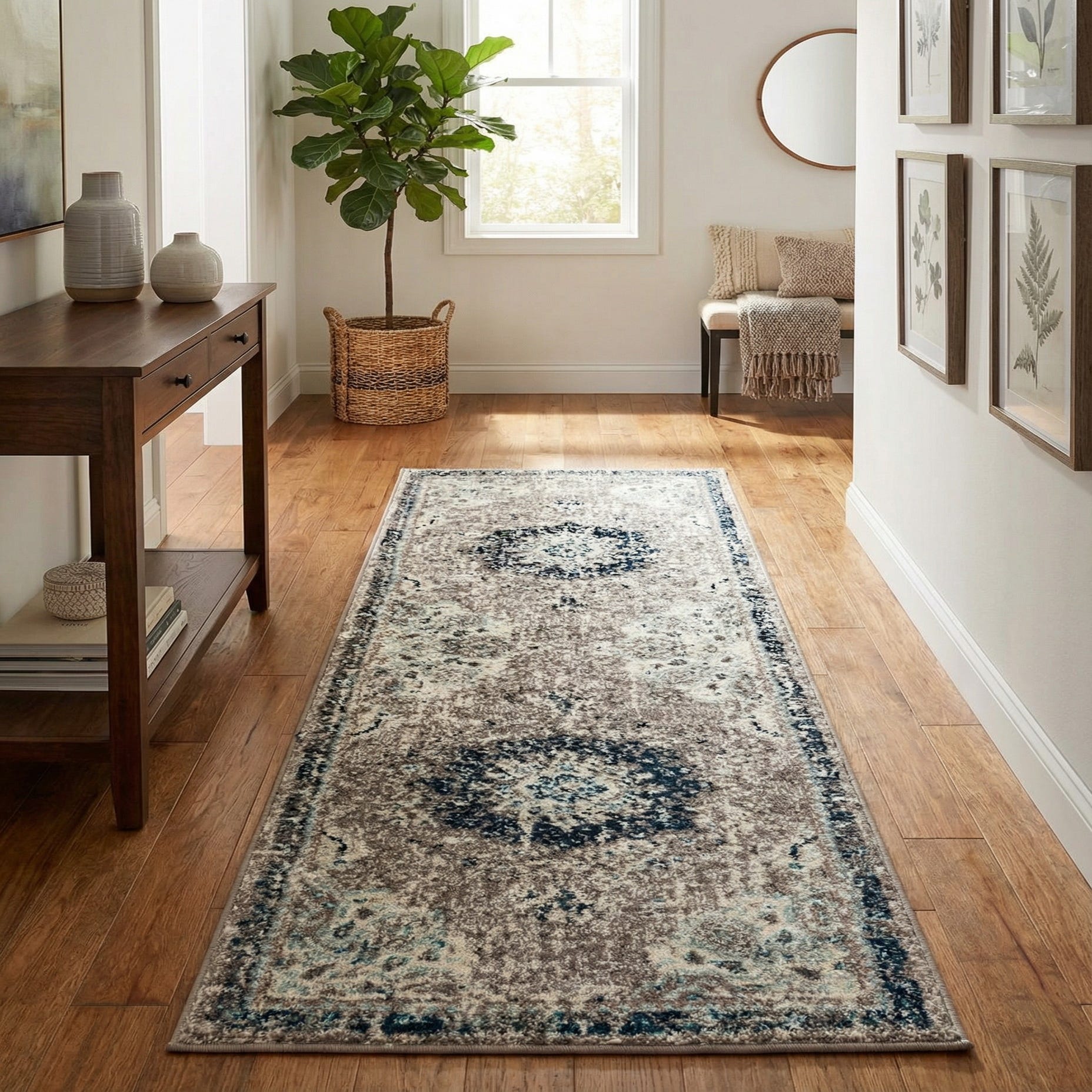 This runner works well in entryways, hallways, or alongside a bed to add length and layered color without overwhelming a space. It pairs nicely with warm wood tones and neutral upholstery, and coordinates with navy or teal accents in transitional, coastal, or casual-traditional interiors.