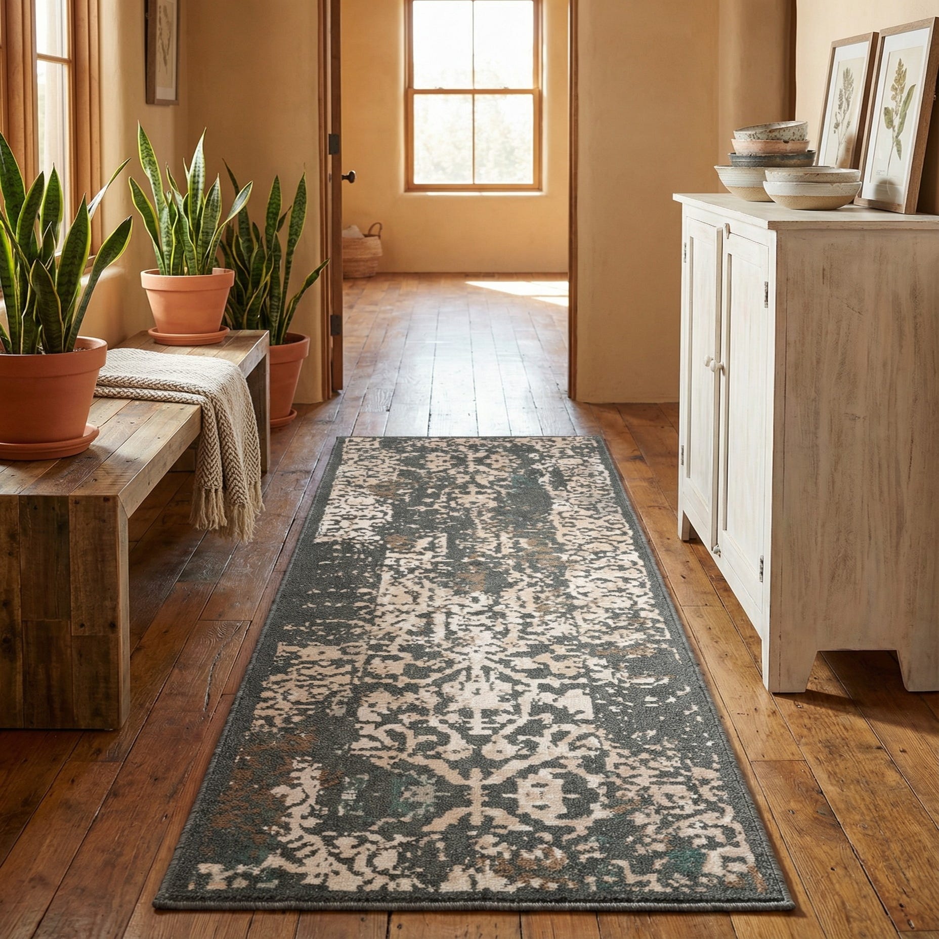 A distressed, vintage-inspired runner with a central medallion and ornamental motifs emerging from a gray field. Beige shapes form the faded design while brown accents and muted green flecks add subtle depth and visual interest. The pattern has an intentionally worn look, where softer edges and layered coloration create a lived-in, textural appearance without high contrast.