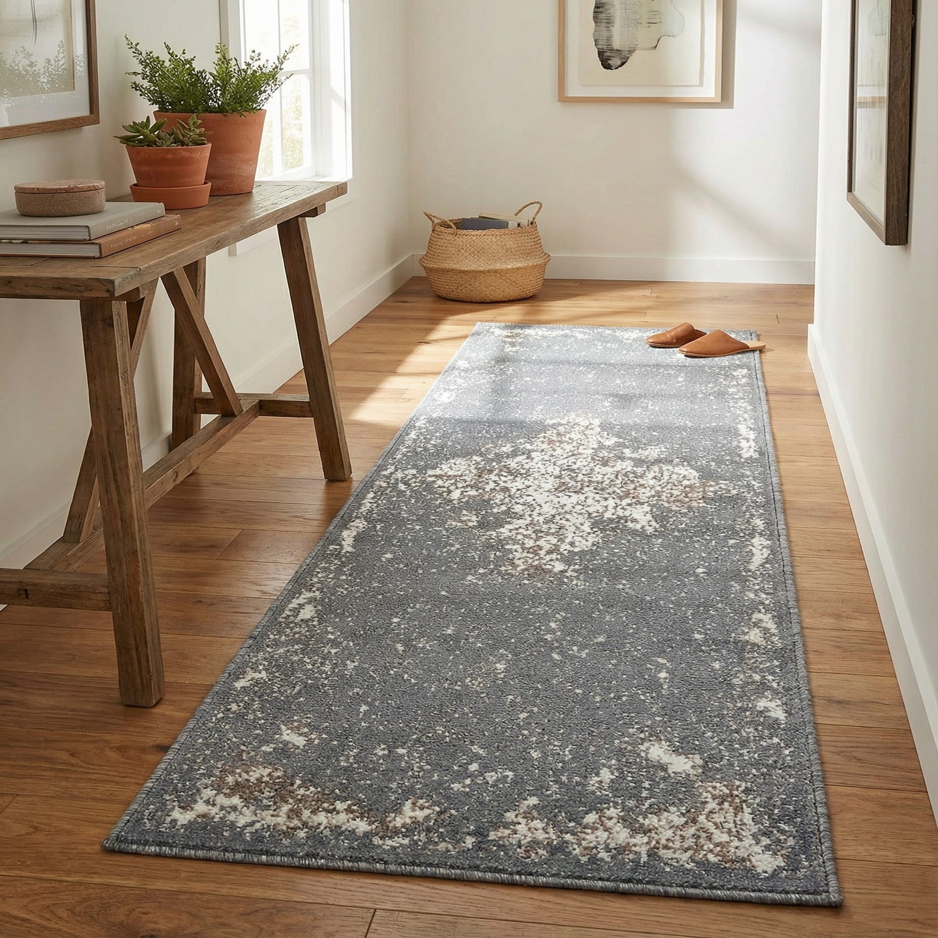 The rug's distressed design and textural variations invoke a sense of depth and sophistication, making it particularly suitable for contemporary and minimalist interiors. The gray background serves as a versatile base, allowing for seamless integration into existing color schemes. This rug's subtle pattern provides visual interest without overwhelming a room, making it a suitable addition to a hallway, entryway, or alongside a kitchen island, where it will softly anchor the space while withstanding regular use.