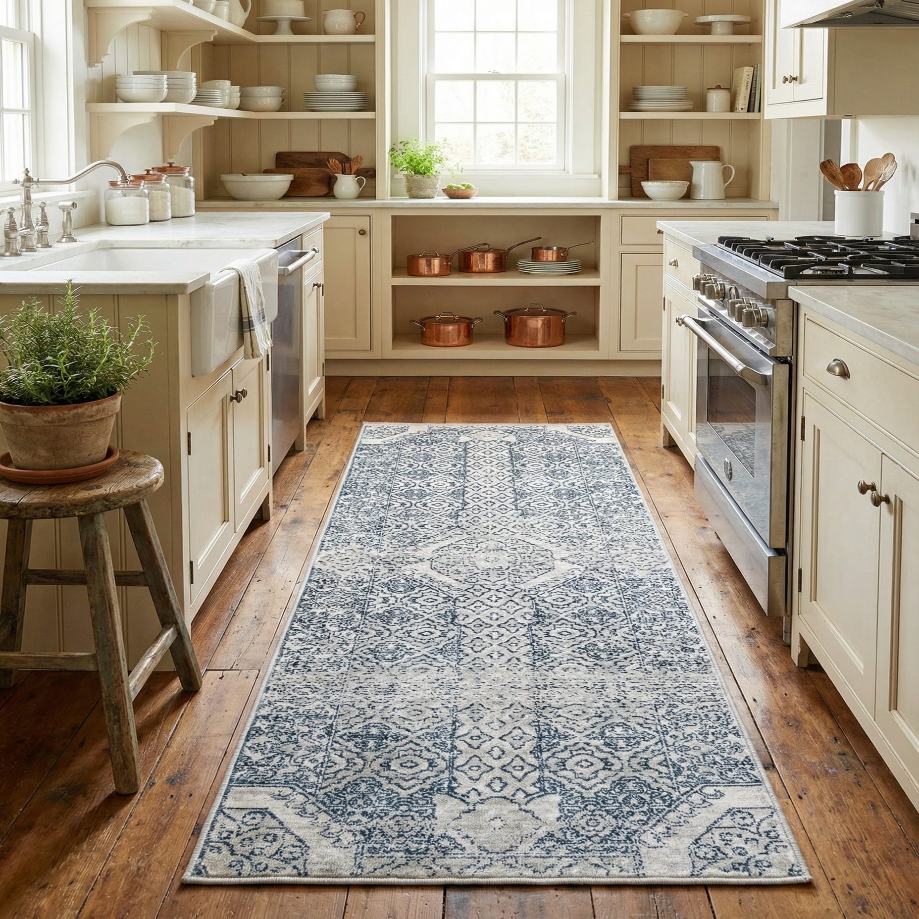 Ideal for narrow spaces where pattern can make an impact, this rug works well in hallways and entryways, alongside a bed, or down the length of a kitchen galley. It pairs naturally with light oak or white-painted floors for coastal and Scandinavian interiors, and fits equally well with leather sofas and metal accents in transitional or modern industrial schemes. The neutral gray background and ivory pattern coordinate easily with cool blues, muted pastels, or a monochrome palette.