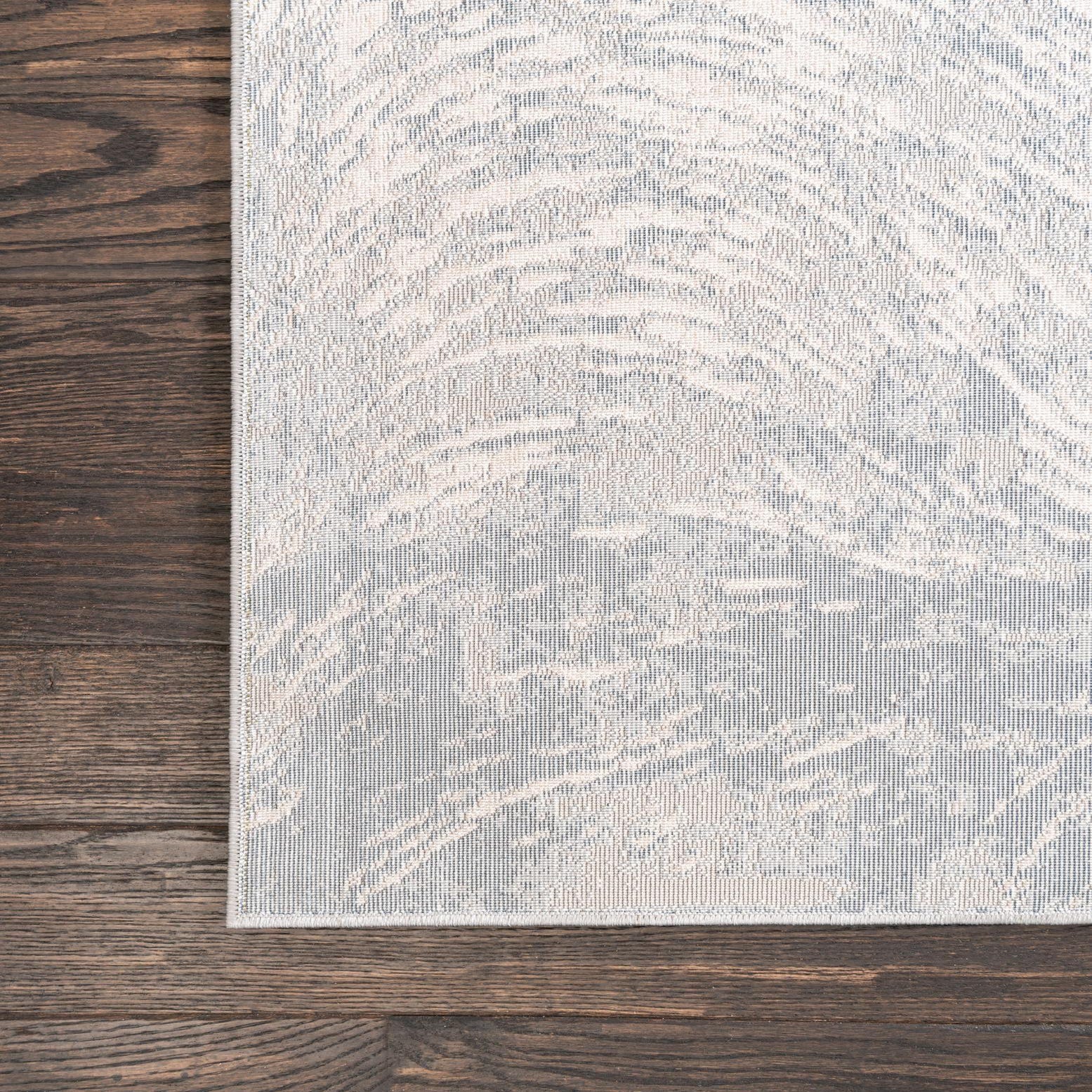 An abstract, brushstroke pattern in ivory sweeps across a gray background, creating a marbled, organic look that reads modern and relaxed. The machine-made construction of 65% polypropylene and 35% polyester produces a soft, slightly plush surface with a subtle sheen and defined pattern contrast. Tactile underfoot, the pile offers a cushioned feel while maintaining the crisp, layered texture of the design.