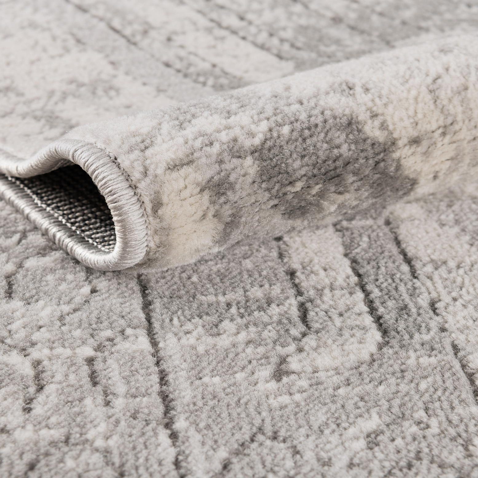 A layered, distressed pattern gives this runner a lived-in, dimensional look that blends abstract linear motifs with hints of traditional ornament. A gray field anchors the design while cream and beige accents pick out the faded details, creating soft contrast and visual texture without overwhelming a space. The overall style sits between contemporary and vintage, making it versatile for a range of interiors.