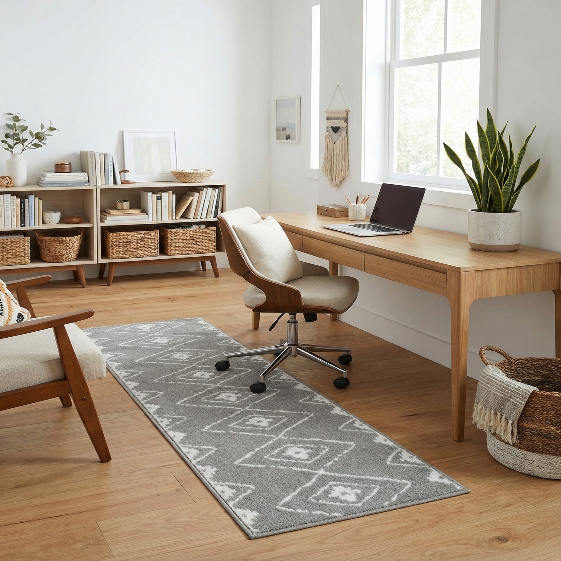 A 6 ft gray runner rug with a modern white geometric diamond pattern, ideal for a hallway or kitchen.