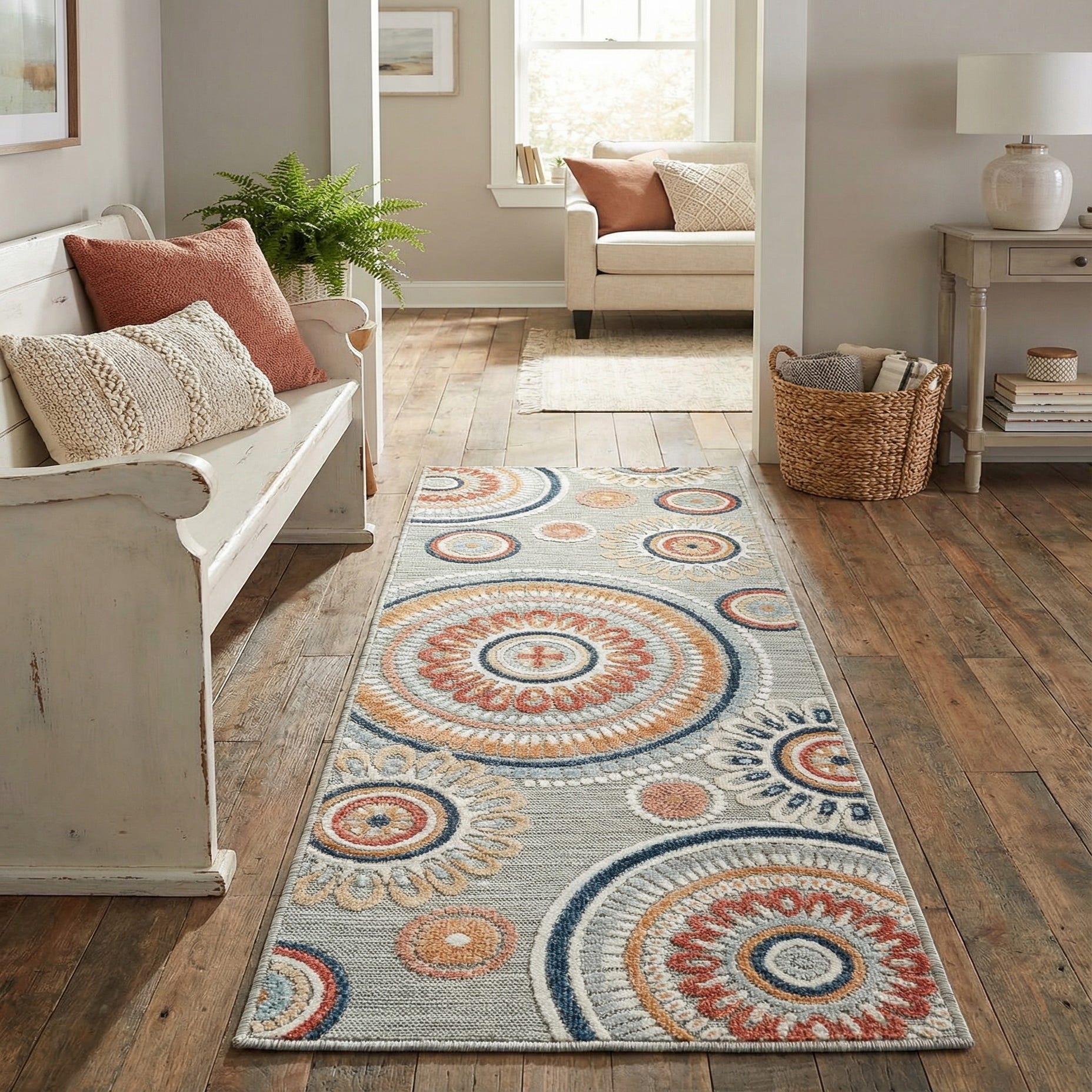 A gray 6 ft runner rug with a modern abstract pattern of large and small colorful mandalas in shades of orange, coral, blue, and cream.