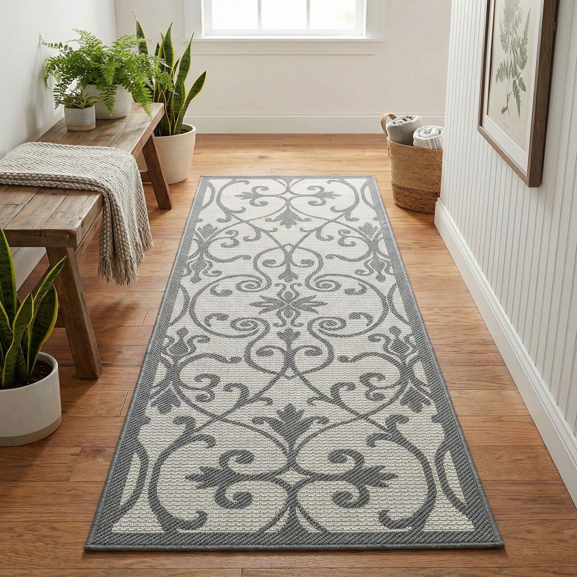 Designed as a runner for narrow spaces, it works well in hallways and entryways as well as alongside kitchen aisles, mudrooms, or covered porches. The gray-and-silver palette coordinates easily with cool neutrals, pale woods, metal accents, and woven accessories, making it a good fit for transitional, modern farmhouse, coastal, or contemporary-traditional interiors.
