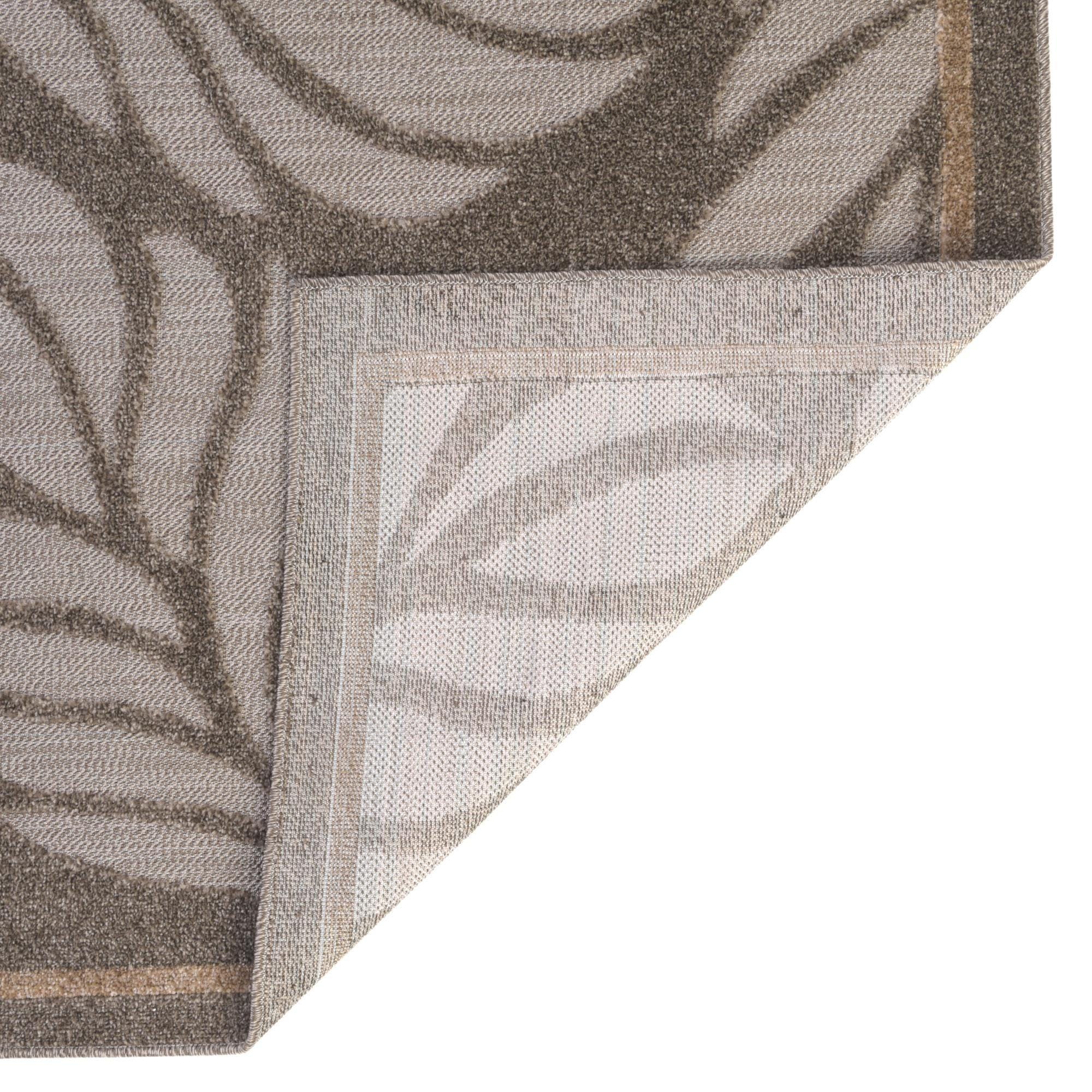 A repeating botanical leaf pattern fills the runner, with layered beige and tan leaves set against a warm gray background. Subtle veining and graduated shading give each leaf a sculpted appearance, while a narrow border frames the composition. Machine made from 100% polypropylene, the rug has a low-profile, tightly woven pile that feels slightly textured underfoot and shows the pattern with soft, dimensional contrast.