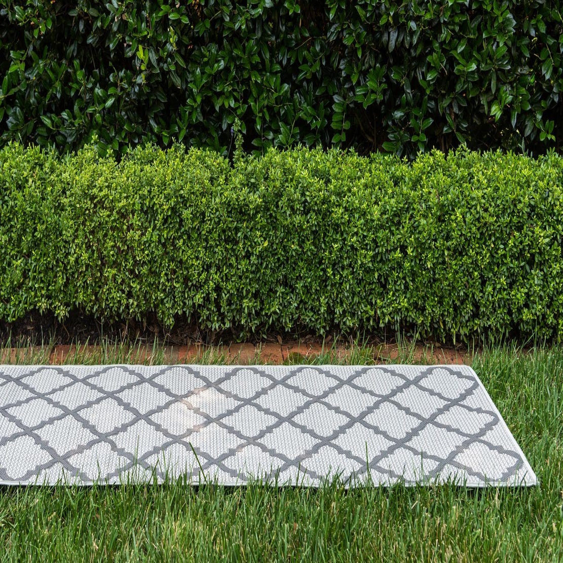 The Outdoor Lattice Collection presents a 6 Ft Runner rug that is both functional and stylish, boasting a timeless lattice pattern. The design showcases interconnecting lines in a bold gray that crisply contrast against the lighter gray background, creating a look that is sophisticated yet suitable for casual settings. Crafted with a machine-woven technique from 100% polypropylene, this rug is durable and built to endure the elements, making it an ideal choice for outdoor spaces such as patios, decks, or poolside areas.