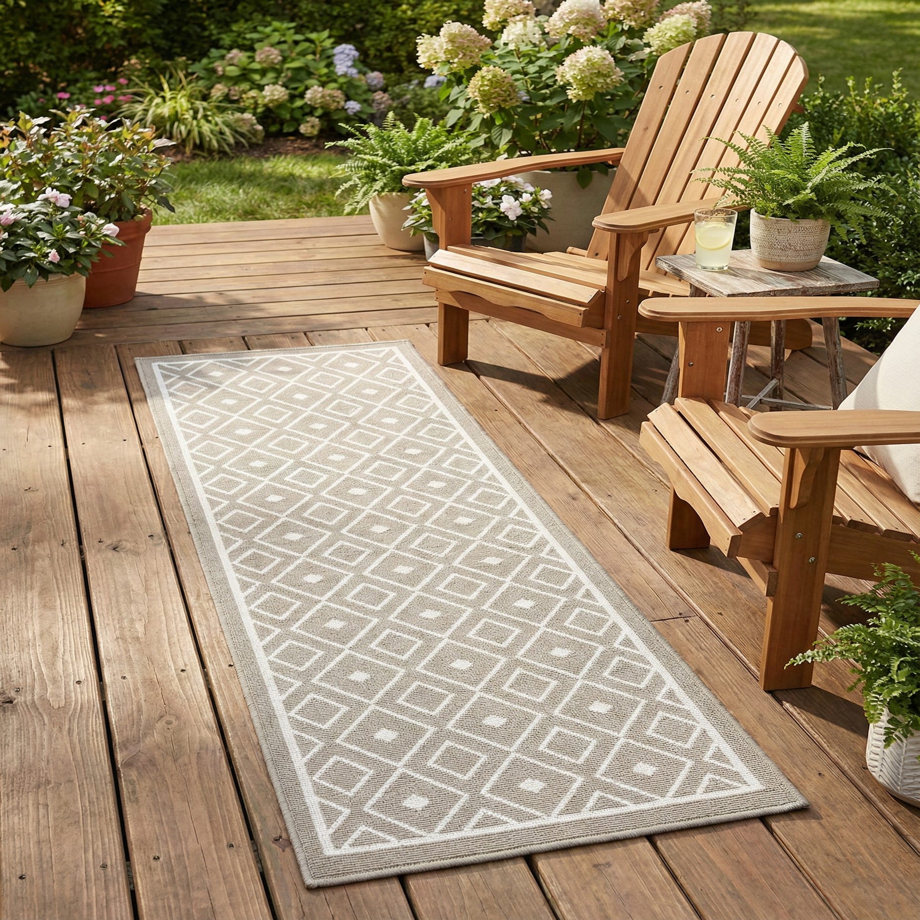This Outdoor Lattice runner is versatile in its application. It would complement a modern outdoor setting on a deck, porch, or patio, functioning as a sleek transition between spaces or as an anchor for outdoor seating. The contemporary pattern and neutral color palette ensure that this rug can effortlessly integrate with various decor styles, from minimalist to coastal. Whether employed as a practical walkway in your garden area or as an inviting touch to a casual outdoor lounge, this runner elevates the space with its clean lines and refined aesthetic.
