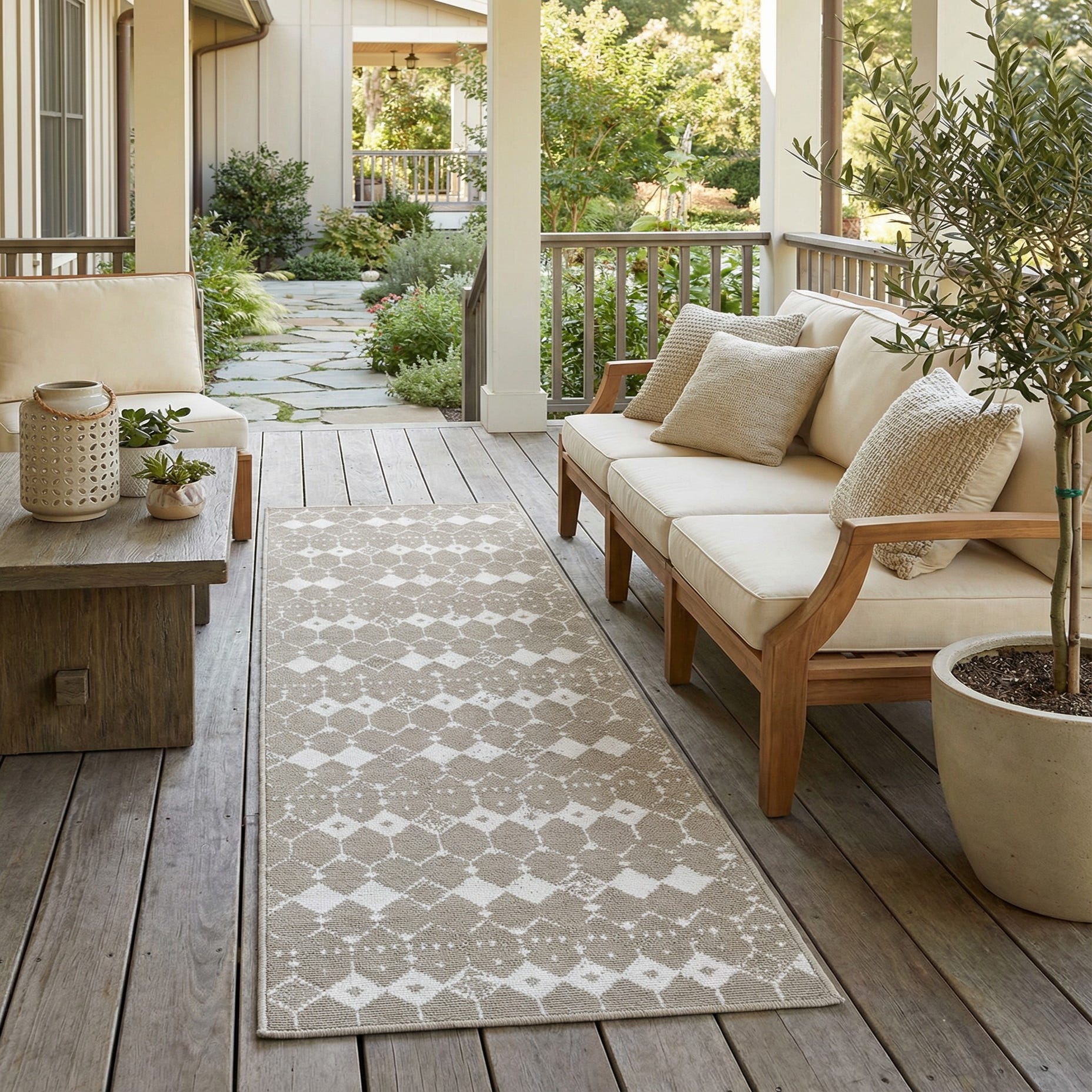 Use it to anchor narrow spaces where both pattern and practicality matter: a busy hallway, entry, galley kitchen, or on a covered porch. It pairs well with light-wood floors and white trim for a Scandinavian or coastal feel, with weathered wood and metal accents in a modern farmhouse scheme, or as a calming, patterned layer in transitional and contemporary interiors.