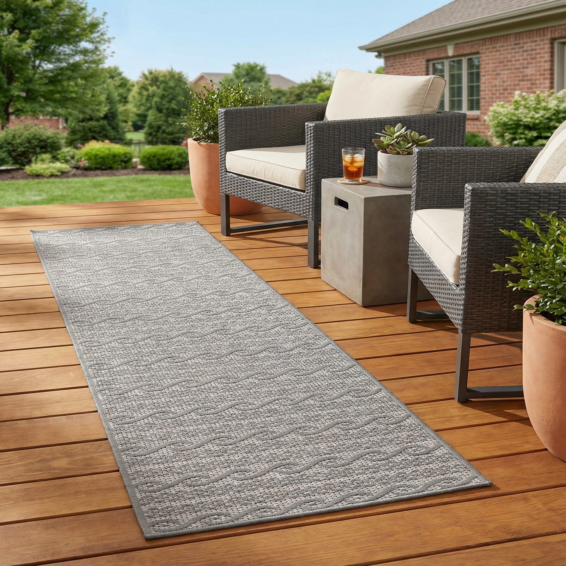 This Outdoor Modern collection 6 Ft Runner rug, machine-woven of 100% polypropylene, offers a harmonious blend of durability and decorative appeal. Showcasing a subtle interplay of gray and silver tones, the rug's versatile color palette anchors spaces with a neutral, contemporary aesthetic. The background hue is a solid gray, overlaid with a minimalist, textural pattern that provides visual interest without overpowering.