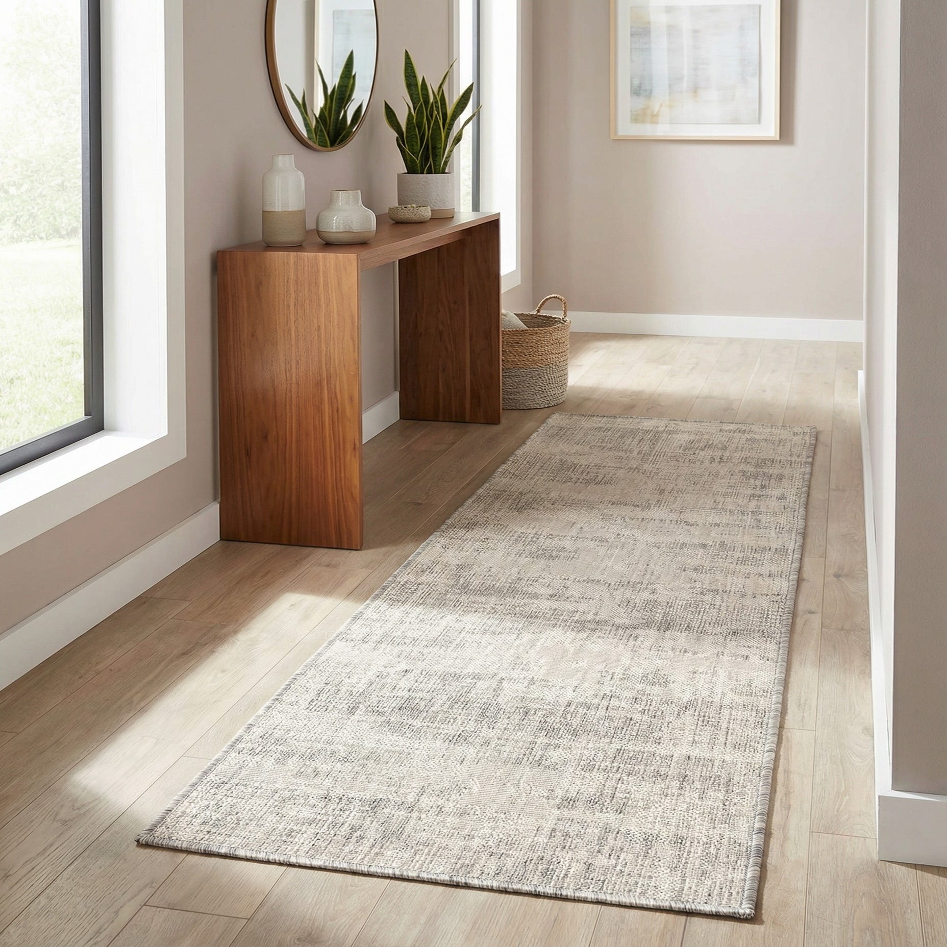 A 6 Ft Runner rug in shades of gray and silver, featuring a textured, flatweave pattern, suitable for indoor/outdoor use.