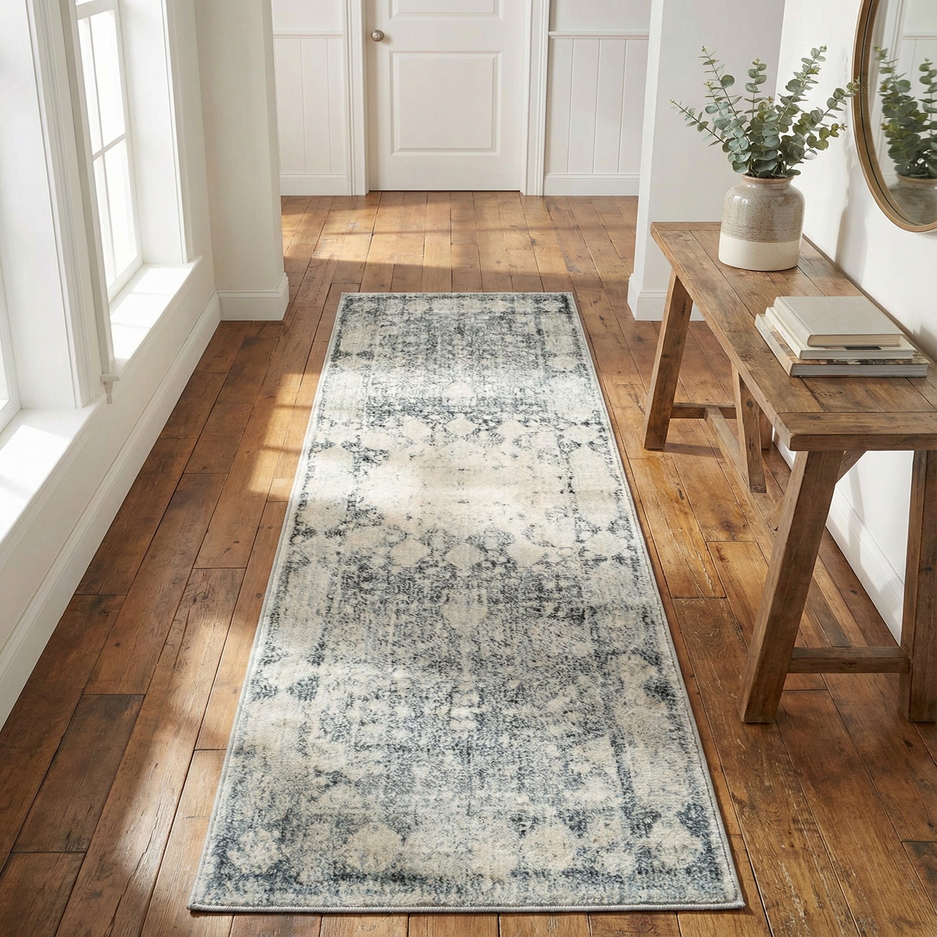 This runner works well in transitional and modern-farmhouse interiors, and it pairs easily with light wood floors, neutral upholstery, or muted metallic accents. Use it to anchor a hallway or entry, line a galley kitchen, or place beside a bed or console to add layered warmth and a soft tactile surface underfoot.