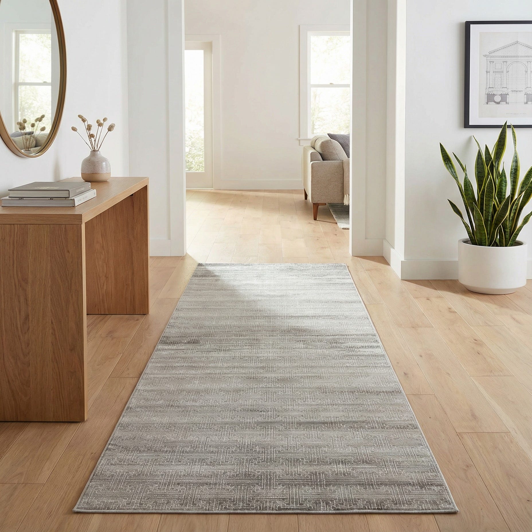 This runner works well in narrow, high-traffic areas such as hallways, entryways, and kitchen corridors as well as alongside beds or in front of a console. The neutral gray and ivory palette pairs cleanly with cool-toned woods, metal accents, and minimalist or transitional furnishings, making it a versatile choice for modern, Scandinavian, or contemporary interiors.