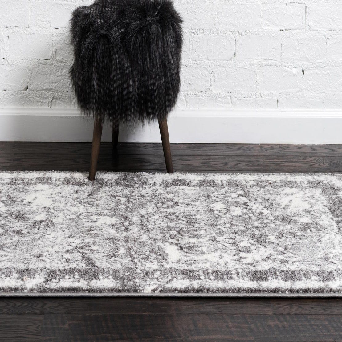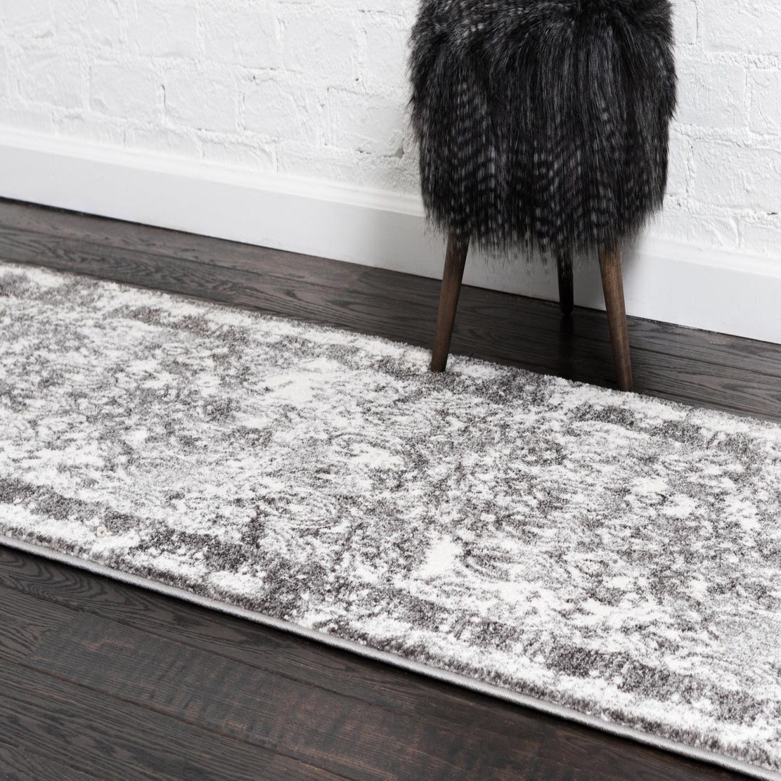 A 6 ft runner rug with a distressed gray and silver abstract pattern, ideal for a hallway or kitchen.