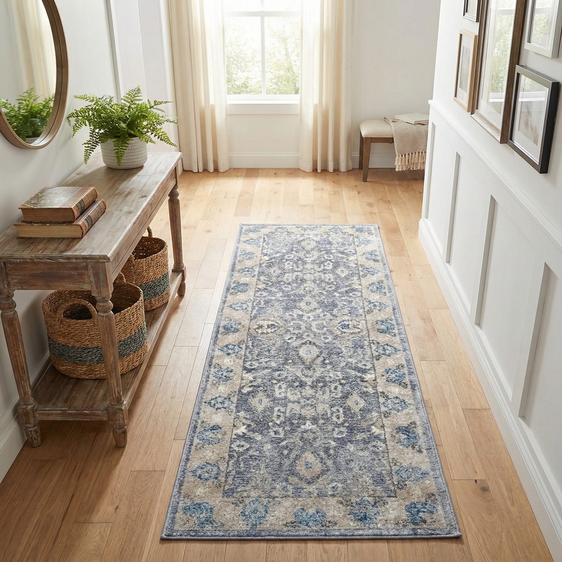 This runner works well in a hallway or entry where a narrower shape defines traffic flow, and it also fits nicely along a kitchen aisle or beside a bed to add a quiet layer of pattern. Pair it with light wood floors and neutral furnishings for a calm, coastal-inspired room, or use it to soften a modern farmhouse or transitional interior with complementary ivory and blue accents.