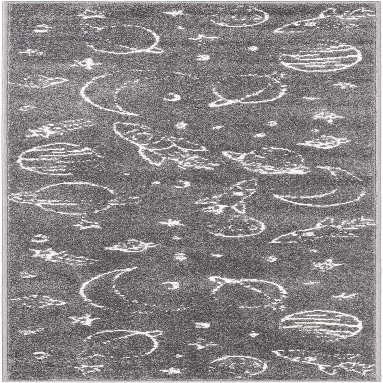 A gray runner rug with a playful white space-themed pattern, featuring planets, rockets, and stars, perfect for a kids' hallway or play area.
