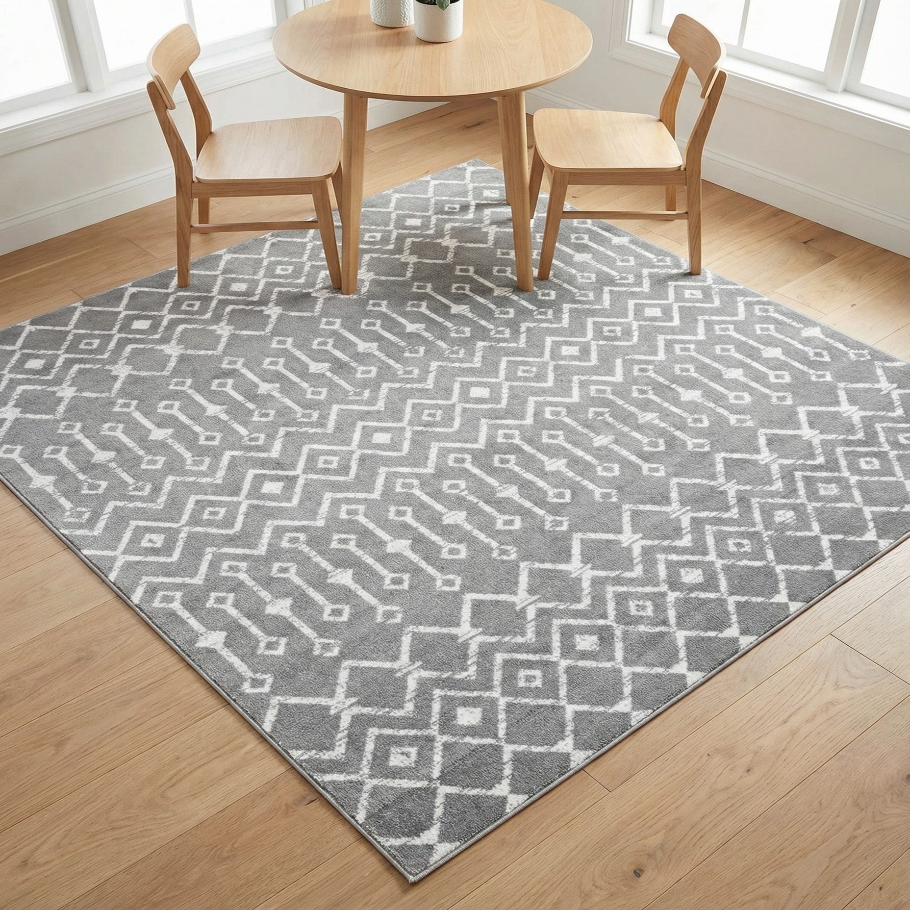 This rug works well in contemporary, transitional, or Scandinavian interiors where a subtle pattern anchors the room without competing with other elements. Place it under a coffee table to define a living area, layer it beneath a dining table for added graphic interest, or set it in a home office or bedroom to introduce soft contrast against light or dark wood floors. The gray-and-ivory palette pairs easily with warm woods, cool metals, and soft linens for a calm, collected aesthetic.