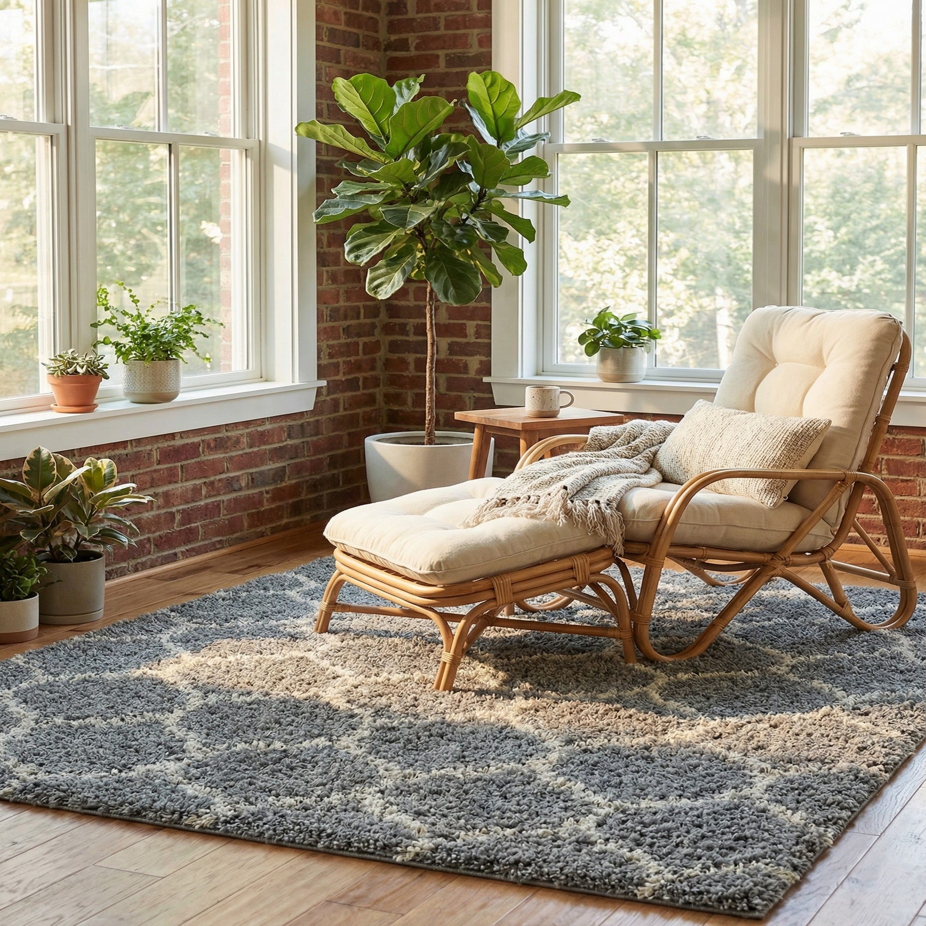 A square 6' 0 x 6' 6 gray shag area rug featuring a modern high/low textured lattice pattern in silver and cream.