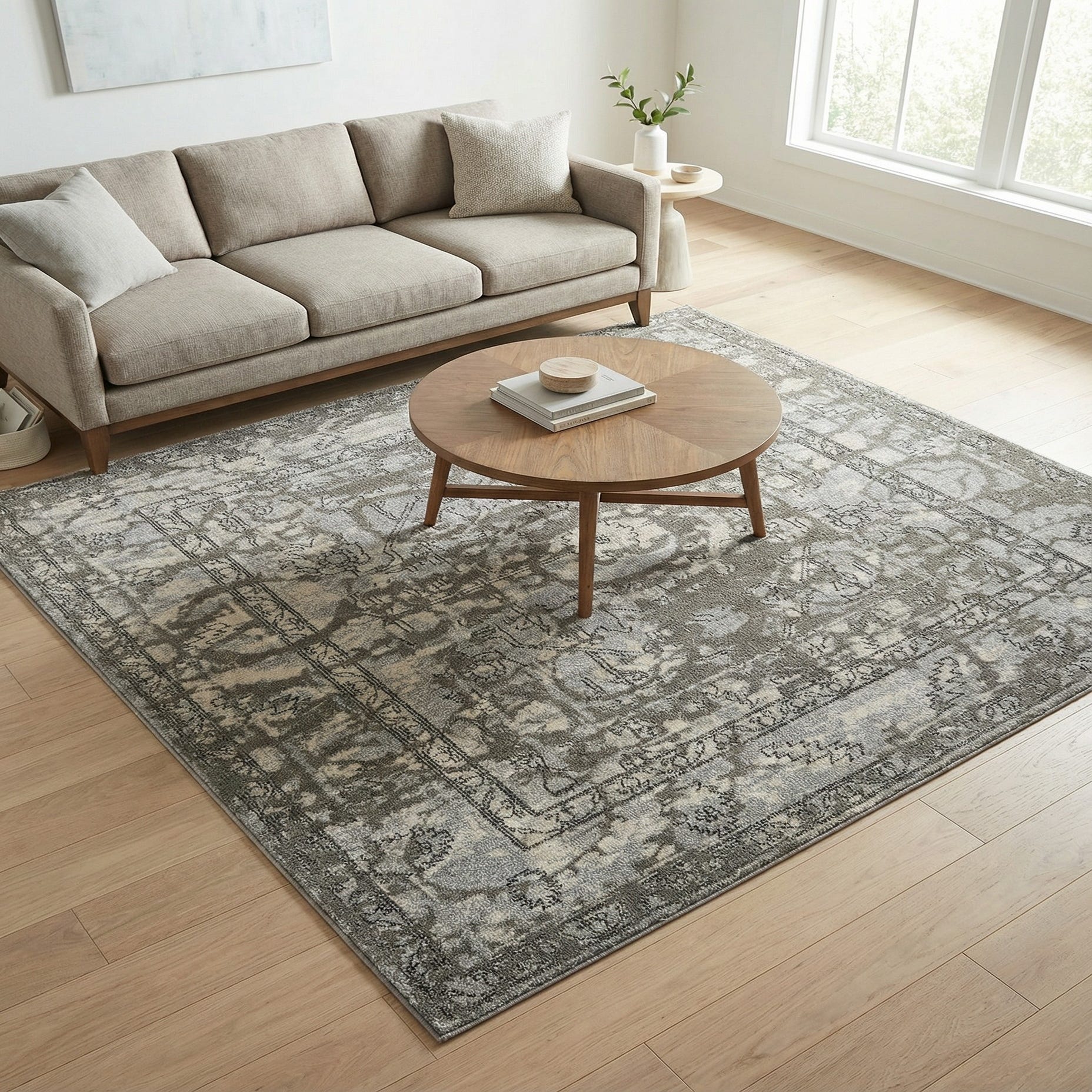 Given its stain-resistant and shed-free properties, this rug is particularly well-suited for high-traffic areas such as living rooms, dining spaces, and bedrooms. The calm colorway couples elegantly with wood flooring, as shown, and complements a range of interior palettes including neutral, cool, and monochromatic designs. It also serves as a grounding element in spaces with minimalist or Scandinavian themes, where clean lines and understated elegance are paramount.