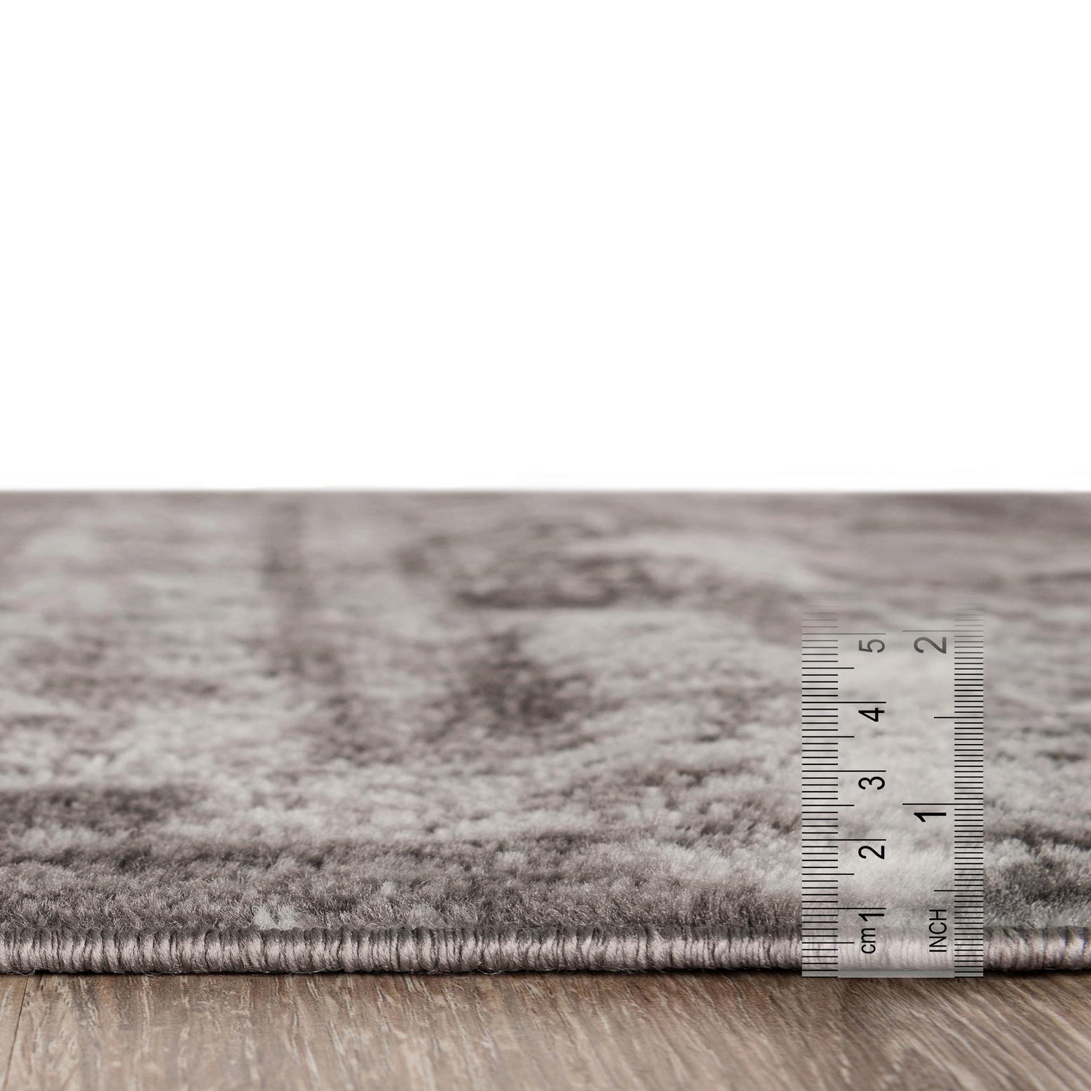 This rug pairs easily with modern and transitional interiors—place it beneath a coffee table to anchor a neutral living room, layer it under a bed to add quiet pattern to a serene bedroom, or use it in a dining area to balance metal or wood furniture. Its muted gray and beige tones work well with cool grays and warm woods alike, and the distressed medallion complements industrial, farmhouse, and contemporary settings that favor relaxed, lived-in finishes.