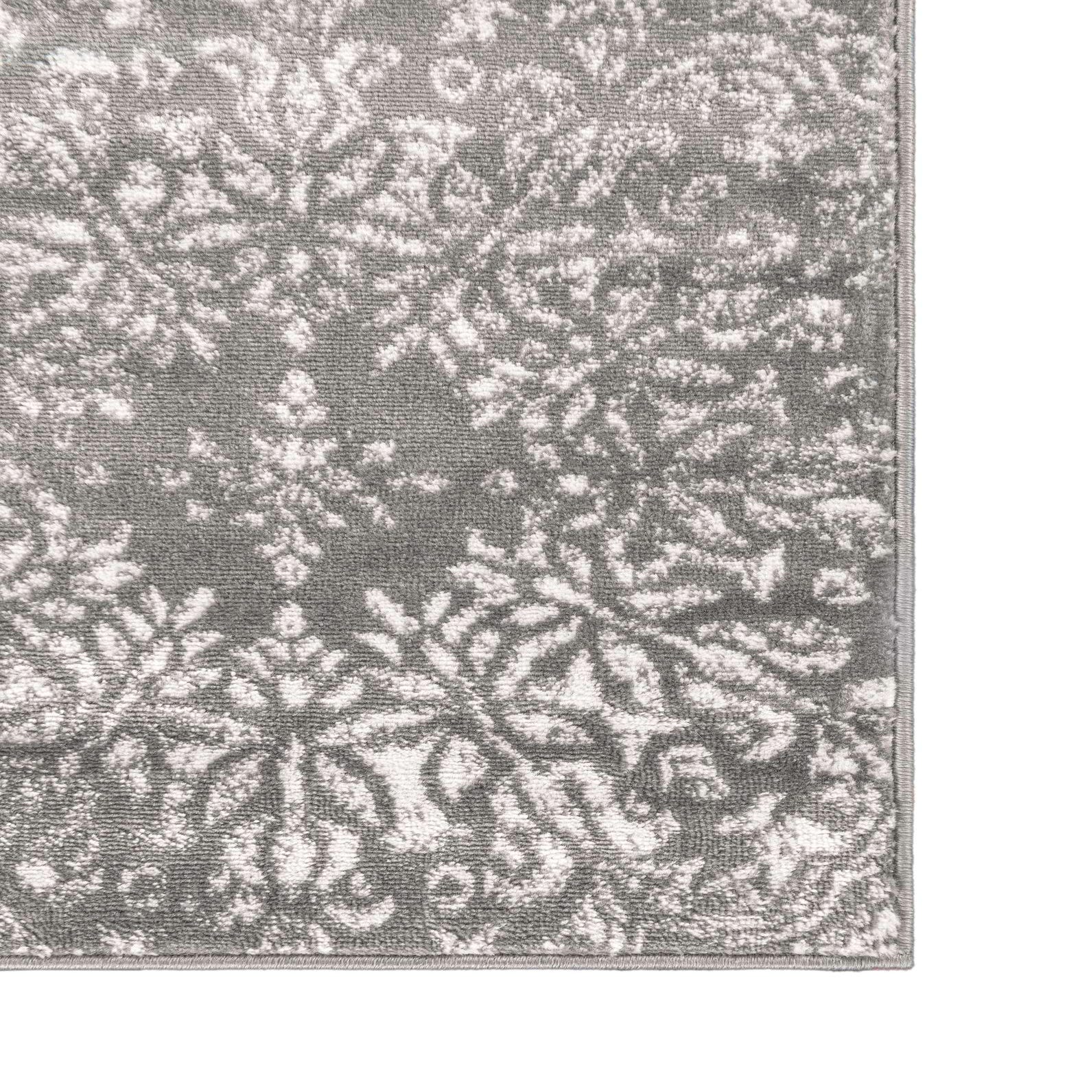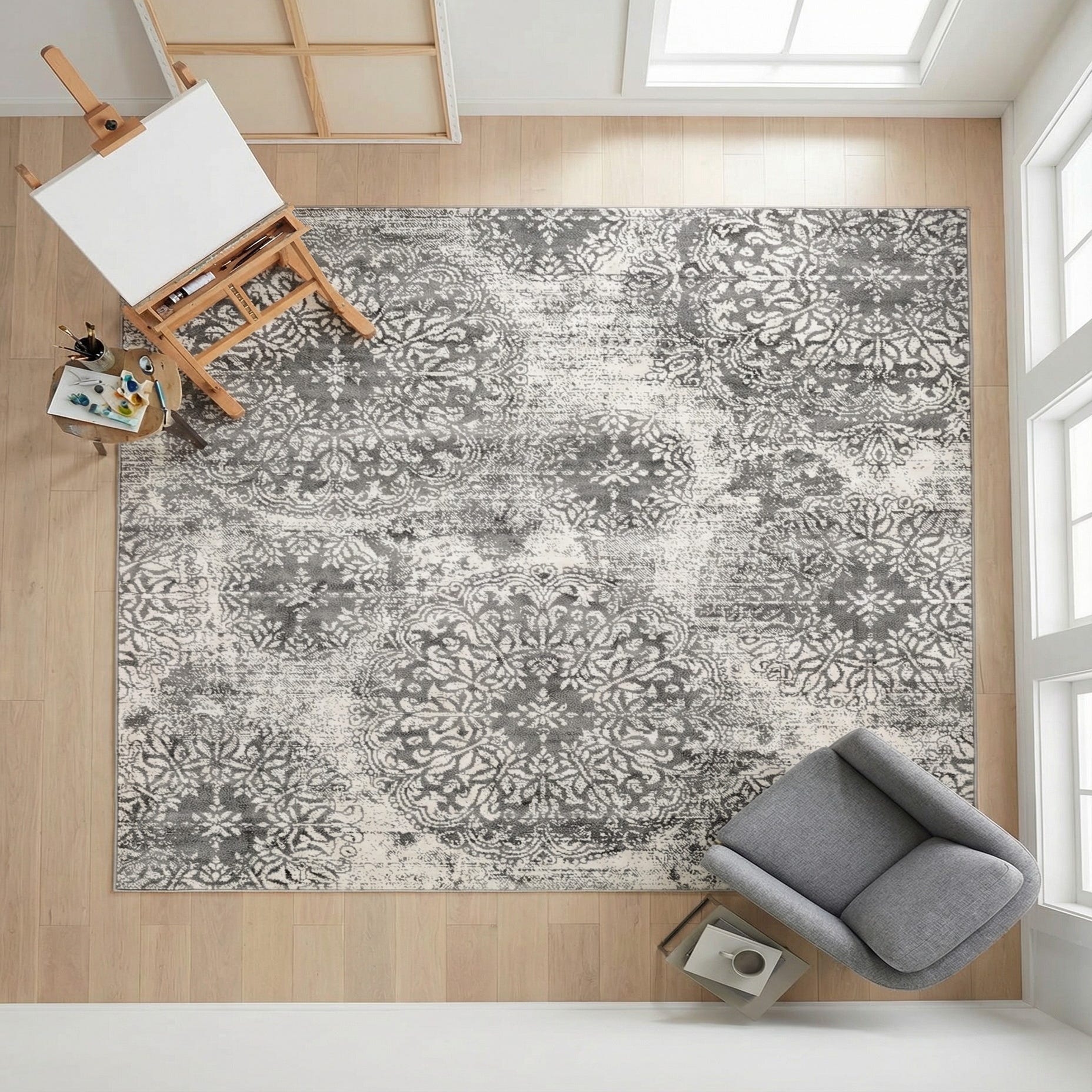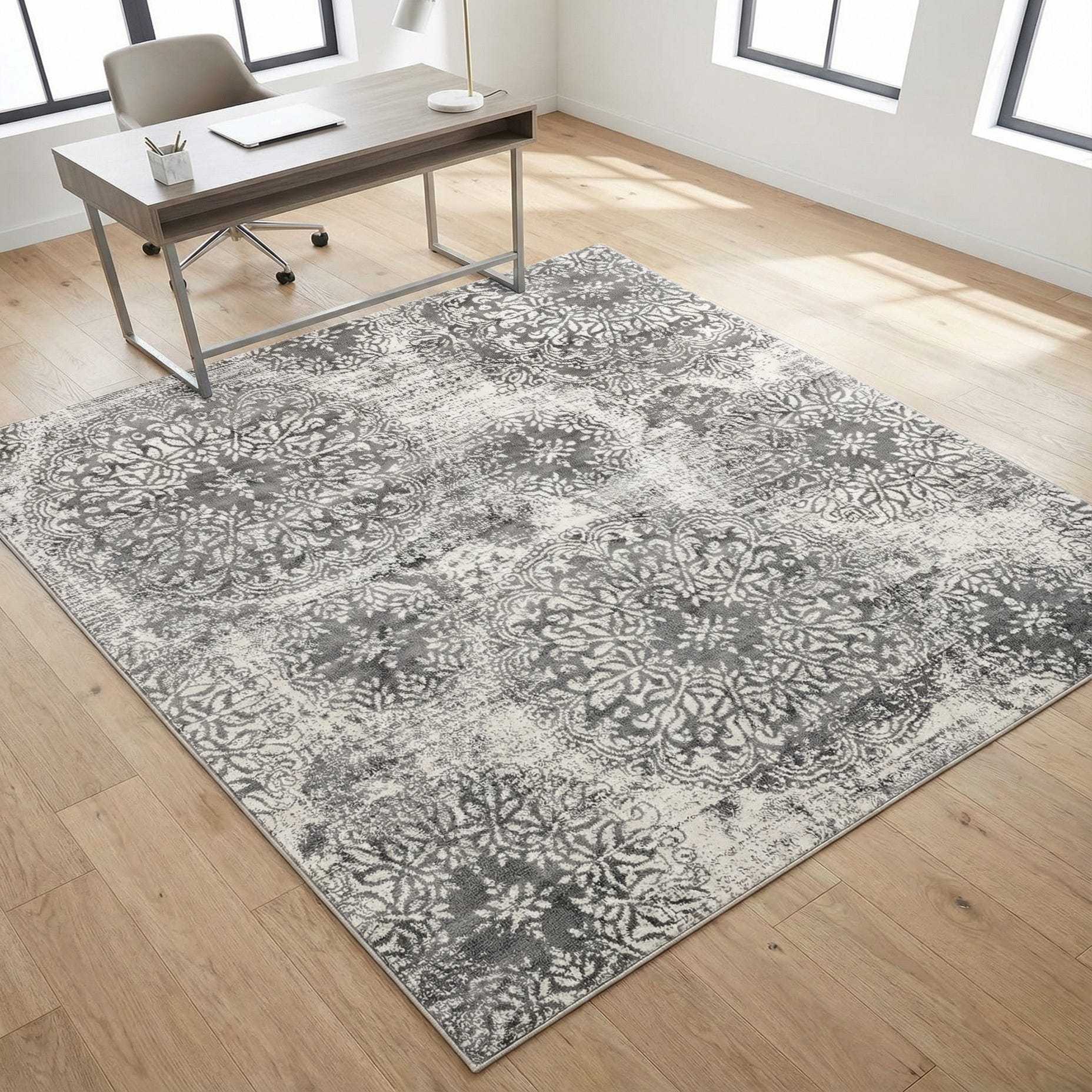 A soft, low-pile rug with a gray ground and ivory ornamental medallions, this piece blends vintage-inspired patterning with a relaxed, lived-in finish. Elaborate floral and lace-like medallions float across a subtly distressed field, creating depth through layered shading rather than bold contrast. The weave has a smooth, slightly dense hand typical of machine-made construction, so the textured pattern is tactile without being raised—pleasant underfoot and steady beneath furniture. Machine-made from 100% polypropylene, the surface holds the pattern definition and color tone consistently across the rug.