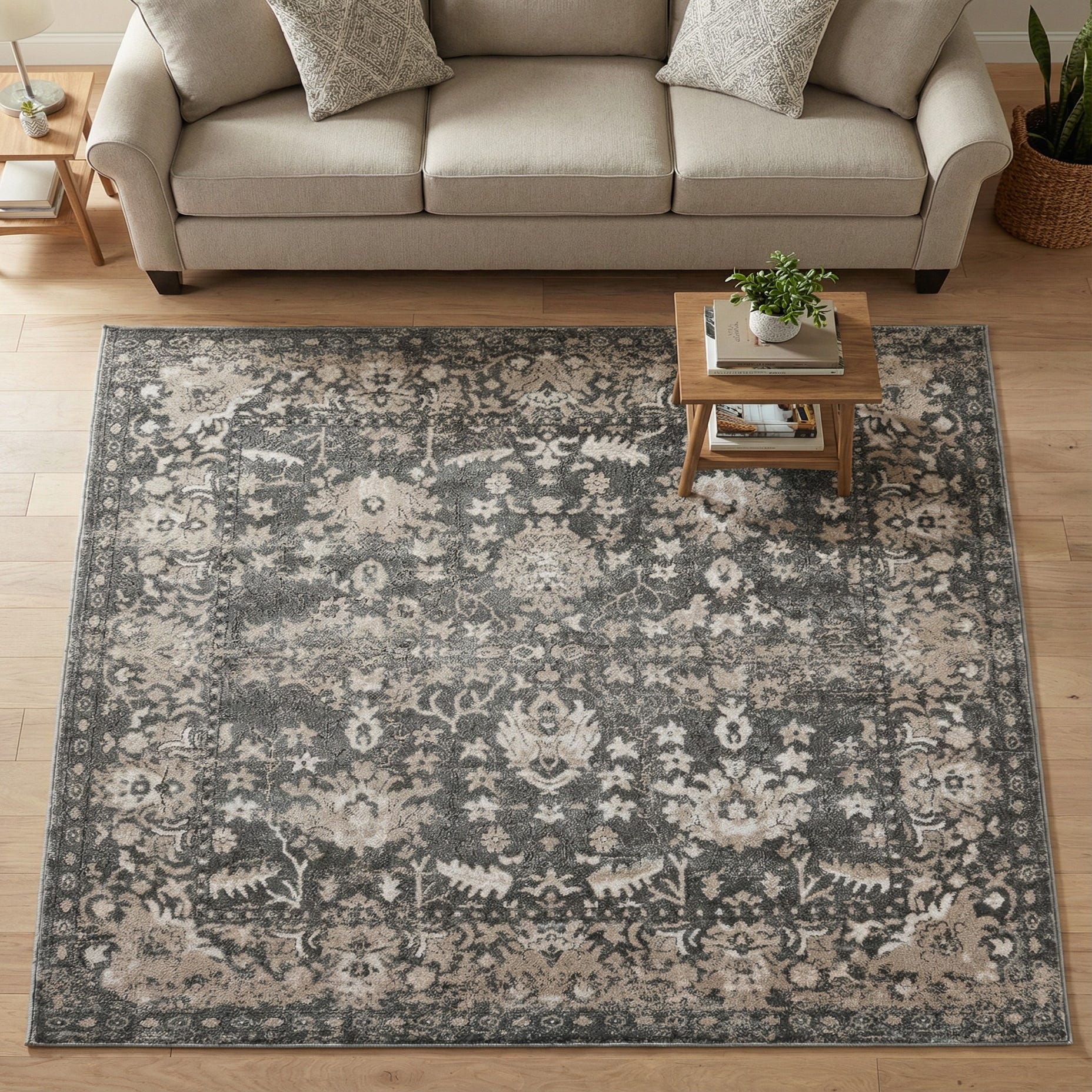 A traditional floral medallion and ornate border are woven into a softly distressed pattern on a gray background, with beige and ivory accents that bring the motifs into gentle relief. The machine-made construction (85% polypropylene, 15% polyester) creates a low-profile pile that feels smooth and slightly plush underfoot, with a subtle sheen where the fibers catch the light. The overall texture is even and close-cut, lending the design a relaxed, lived-in look while keeping the surface comfortable to touch.