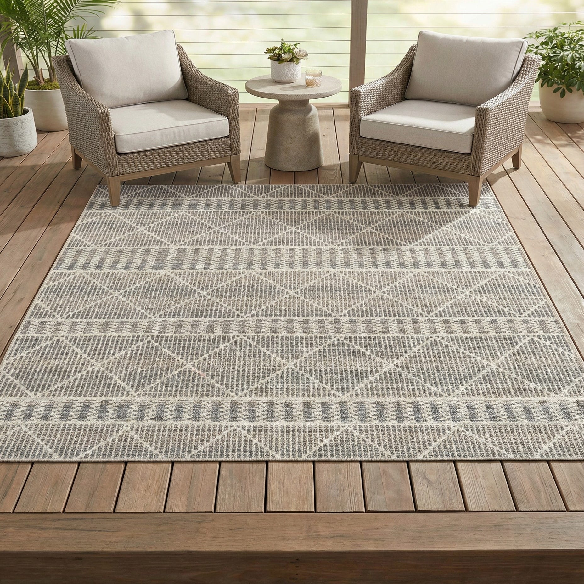 This versatile pattern works well in both indoor and covered outdoor spaces. Use it to define a casual seating area on a patio or sunroom, beneath a coffee table in a modern living room, or to add subtle pattern to an entryway or dining nook. The neutral Gray ground with warm beige and ivory accents pairs easily with contemporary, coastal, and transitional decors, complementing natural wood tones, painted furniture, or streamlined metal pieces.