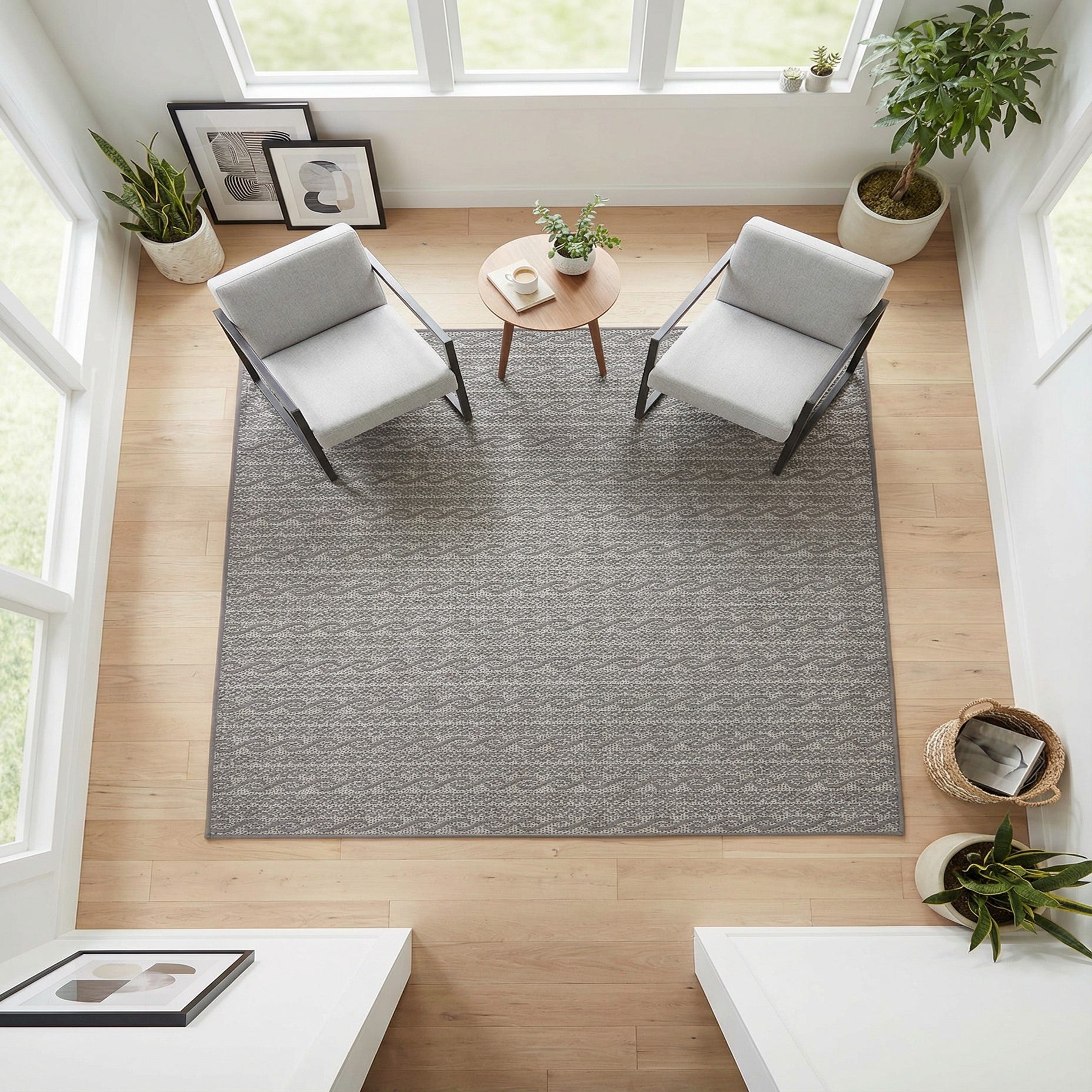 This neutral palette and understated pattern work well in a range of settings: layered beneath a minimalist outdoor seating group or bistro set, anchoring a contemporary sunroom with metal and wood accents, or adding quiet texture to a modern living room or screened porch. Pair it with cool-toned linens, light oak or concrete furnishings, and silver or chrome accents for a cohesive, relaxed look.