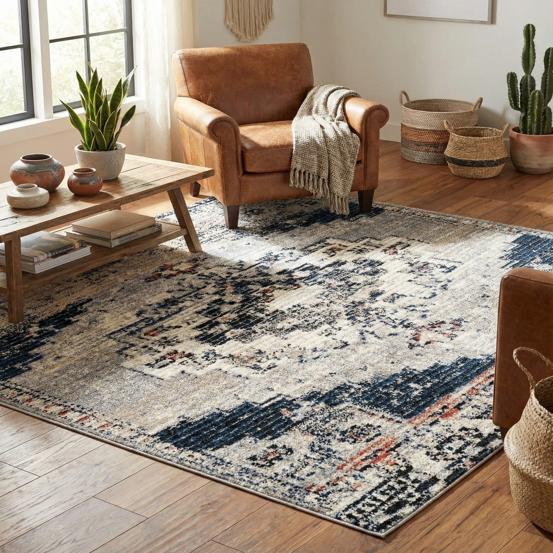 A central medallion and softened border motifs form a vintage-inspired pattern framed by a gray field. Ivory highlights define the medallion while navy blue and black anchor the corners, and rust red and beige accents punctuate the design for warmth and contrast. The overall look blends traditional medallion styling with a distressed finish that gives the pattern a lived-in, layered appearance.