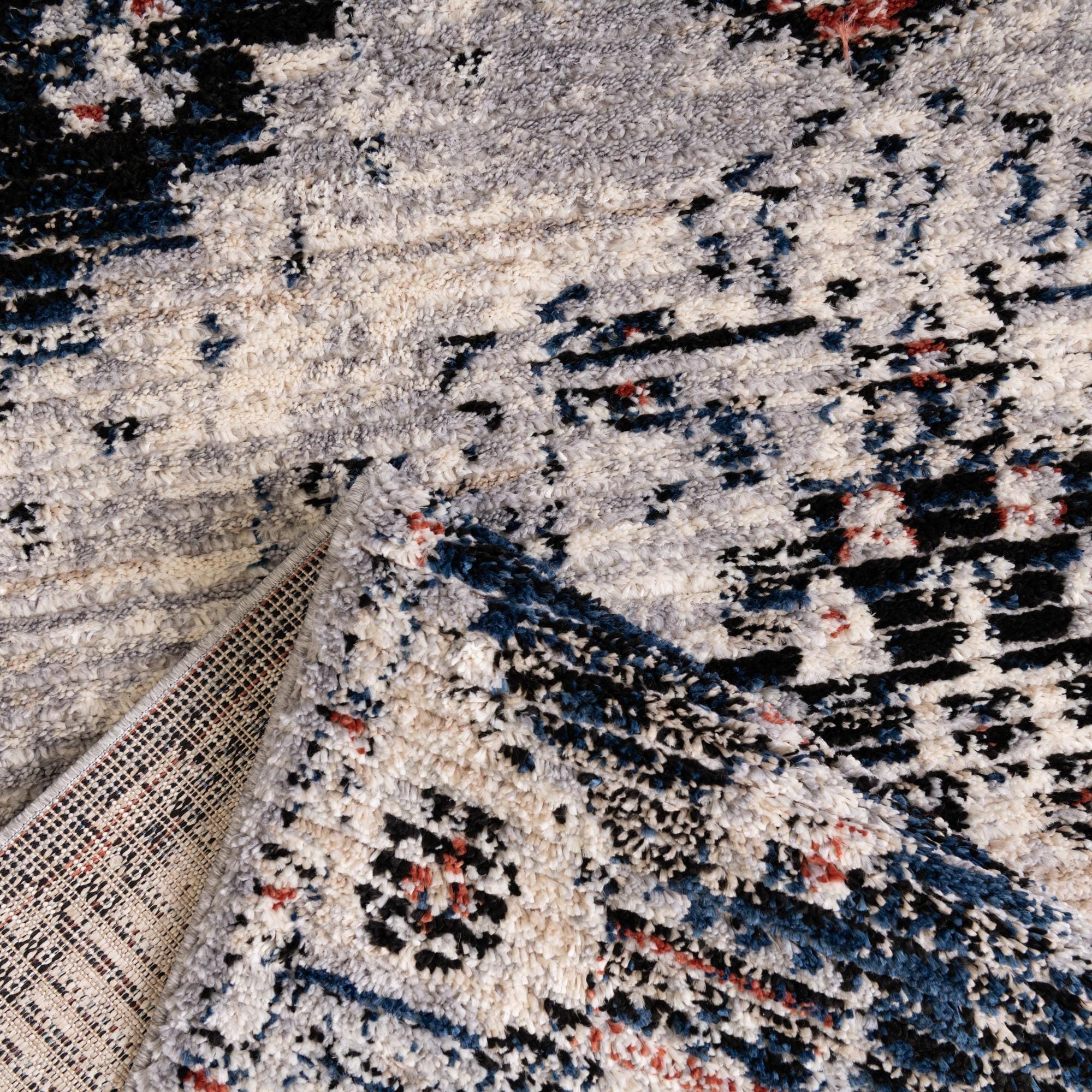 Primary color is Gray. Colors in this rug include: Gray, Beige, Black, Ivory, Navy Blue, Rust Red.