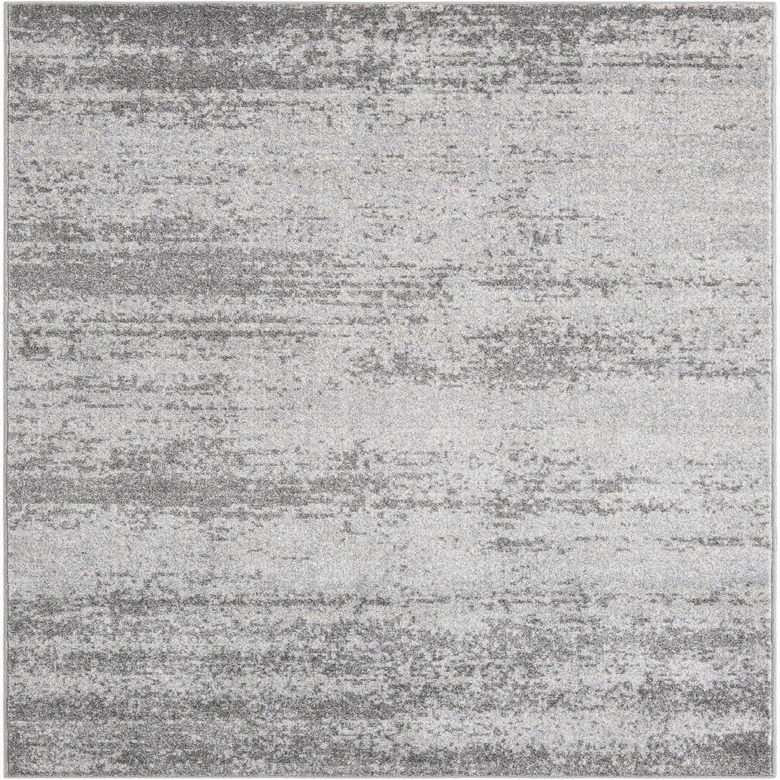 A 6x9 rectangular gray and silver area rug featuring a subtle distressed, abstract pattern with varying shades.