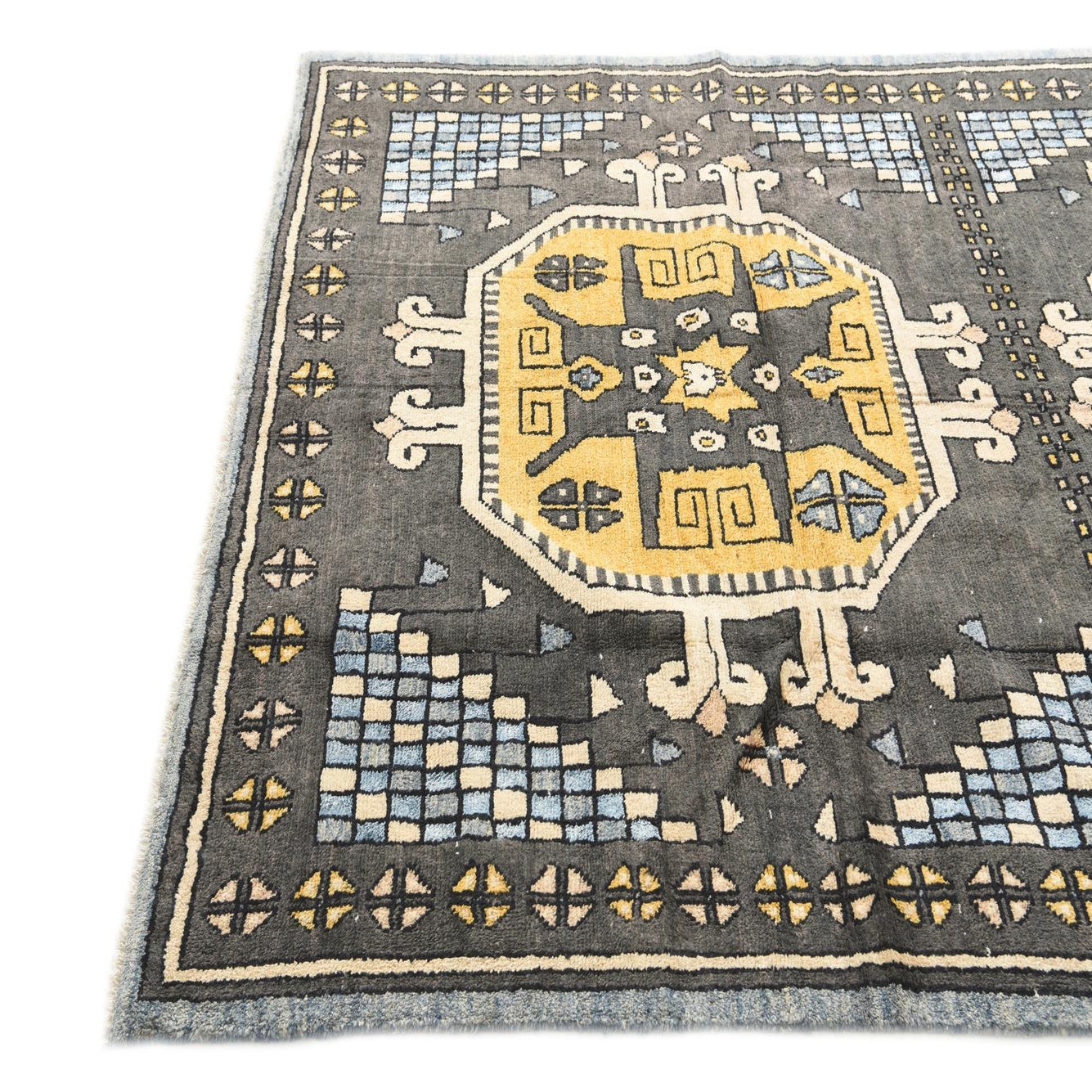 The Darya collection features a hand-knotted wool and silk rug that brings a sophisticated and timeless appeal to any living space. This 6x9 rug is a testament to traditional craftsmanship, boasting a plush texture that is both inviting and durable. The rug presents a harmonious pattern accentuated by a gray background, with a medley of detailed motifs in colors of ivory, yellow, black, light blue, and peach. The intricate designs and symbols on the rug suggest a fusion of classic elements with a touch of modernity.