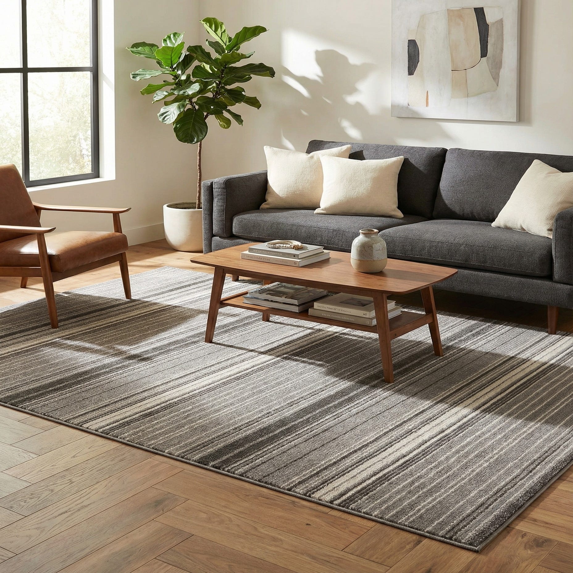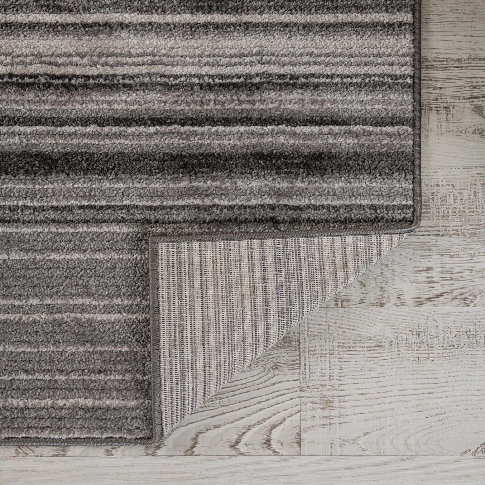 A 6x9 rectangular gray area rug with a modern striped pattern and textured pile, suitable for a living room.