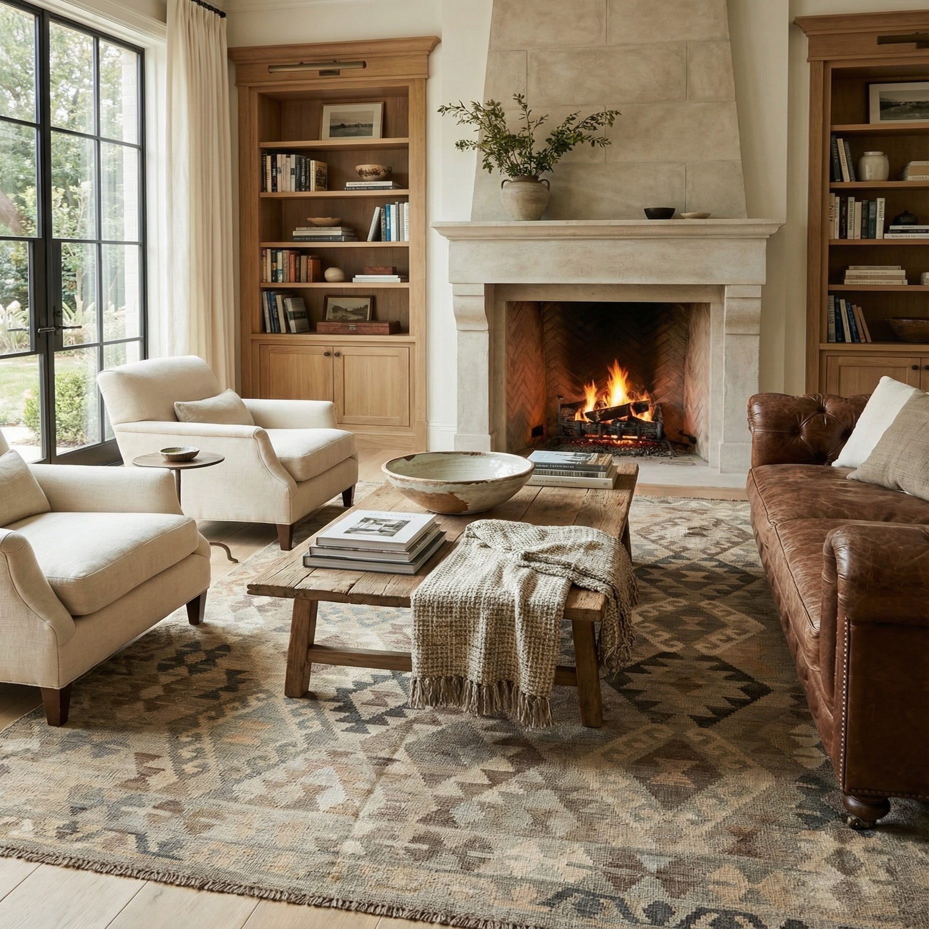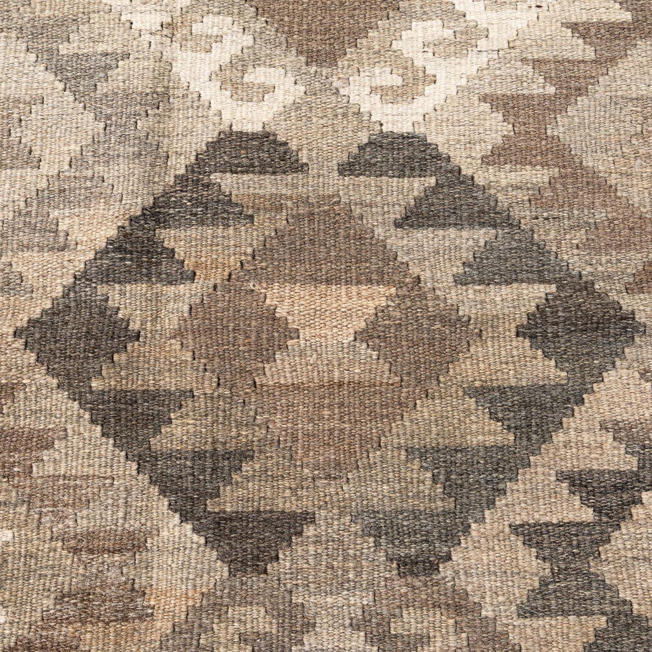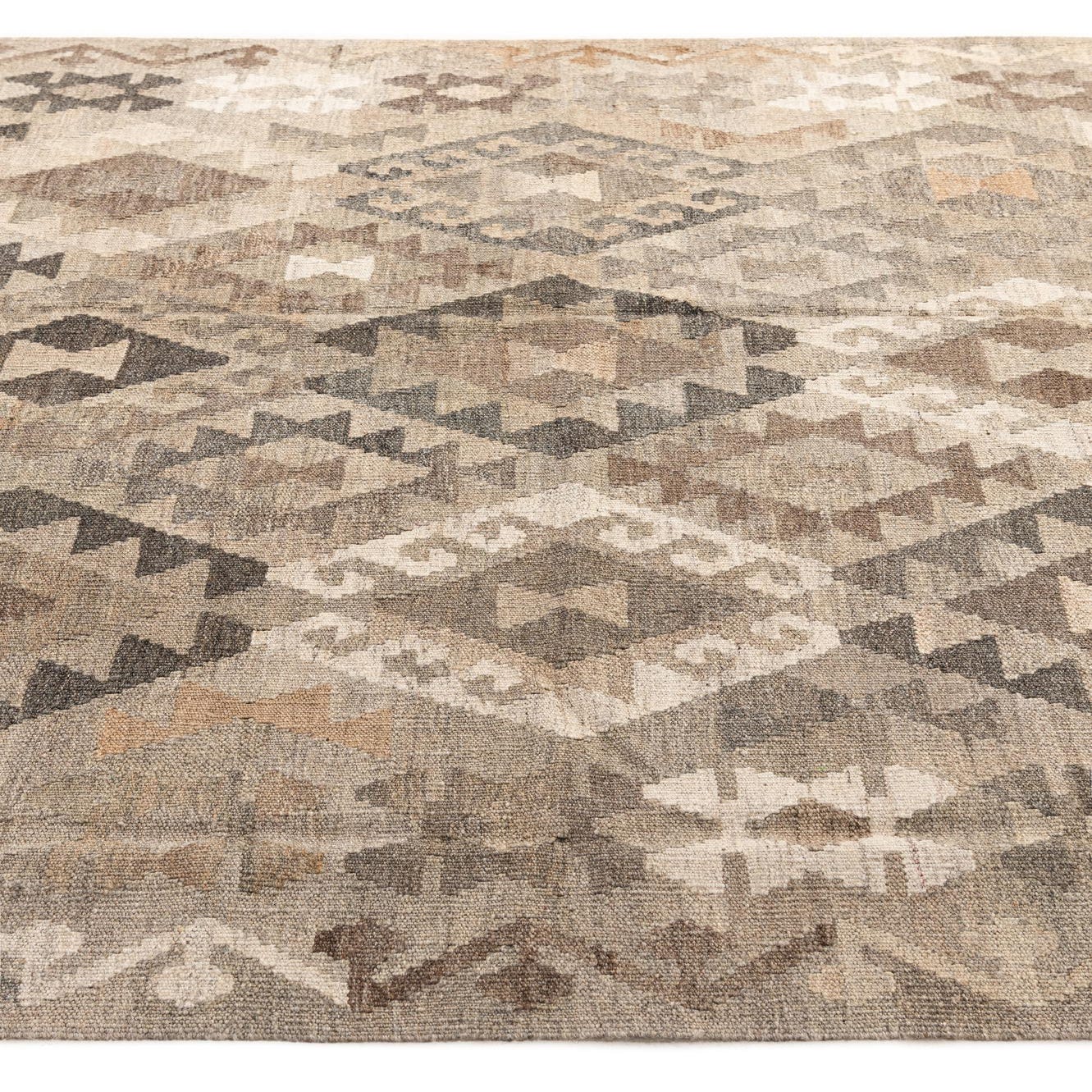 A 6x9 rectangular Kilim Maymana rug featuring a tribal geometric pattern in various shades of gray, silver, and brown, suitable for a living room.