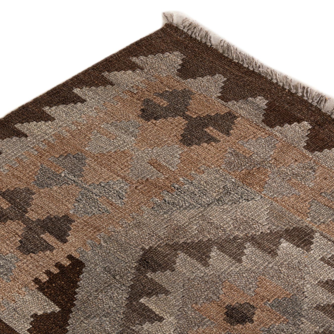 A 6x9 rectangular gray tribal flatweave wool rug with a repeating diamond pattern in varying shades of gray, brown, and subtle peach tones.