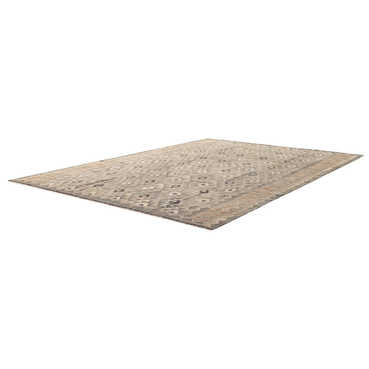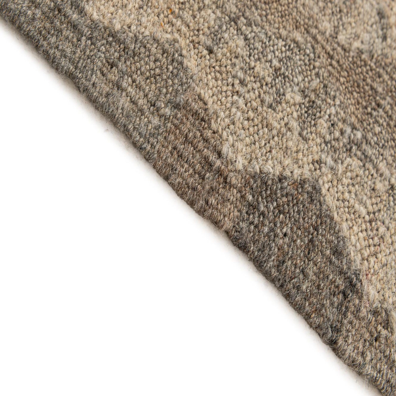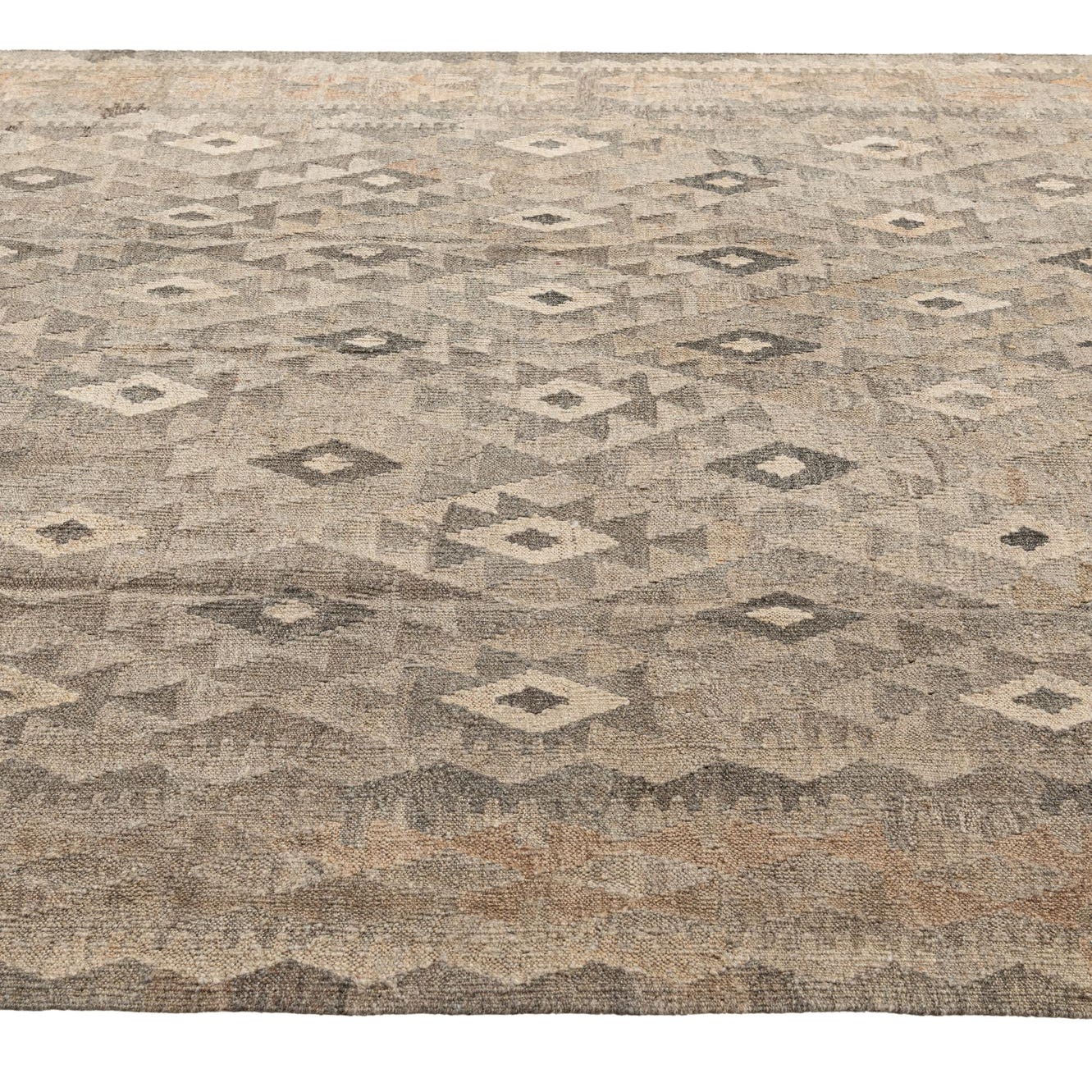 A 6x9 rectangular Kilim Maymana wool rug in shades of gray and silver with a tribal diamond pattern and flatweave texture.