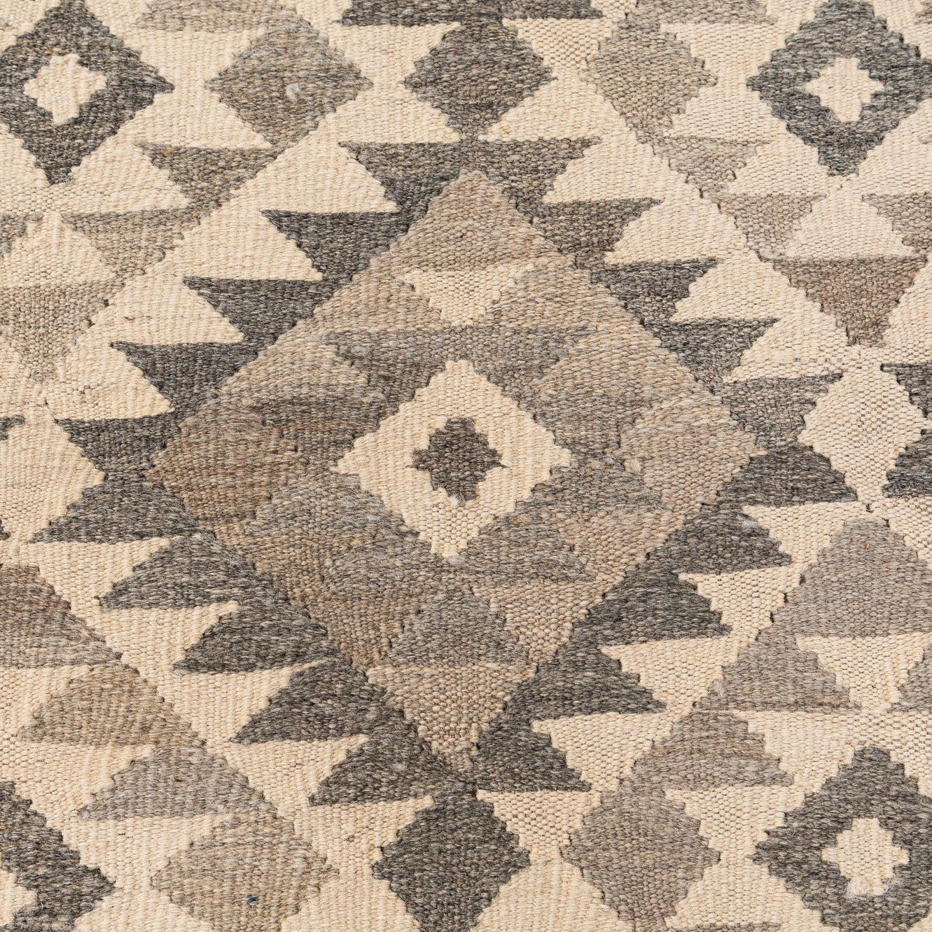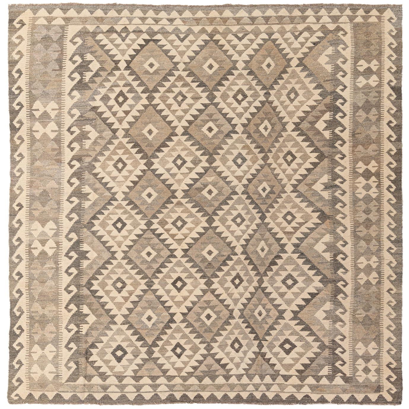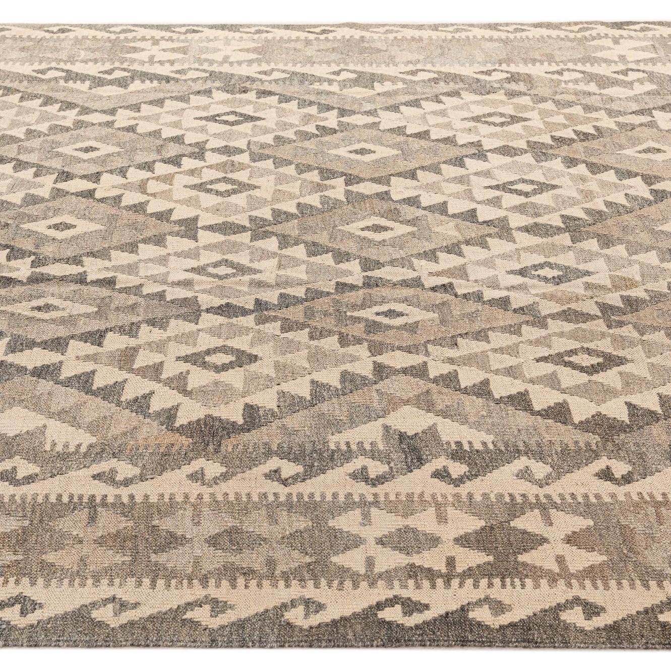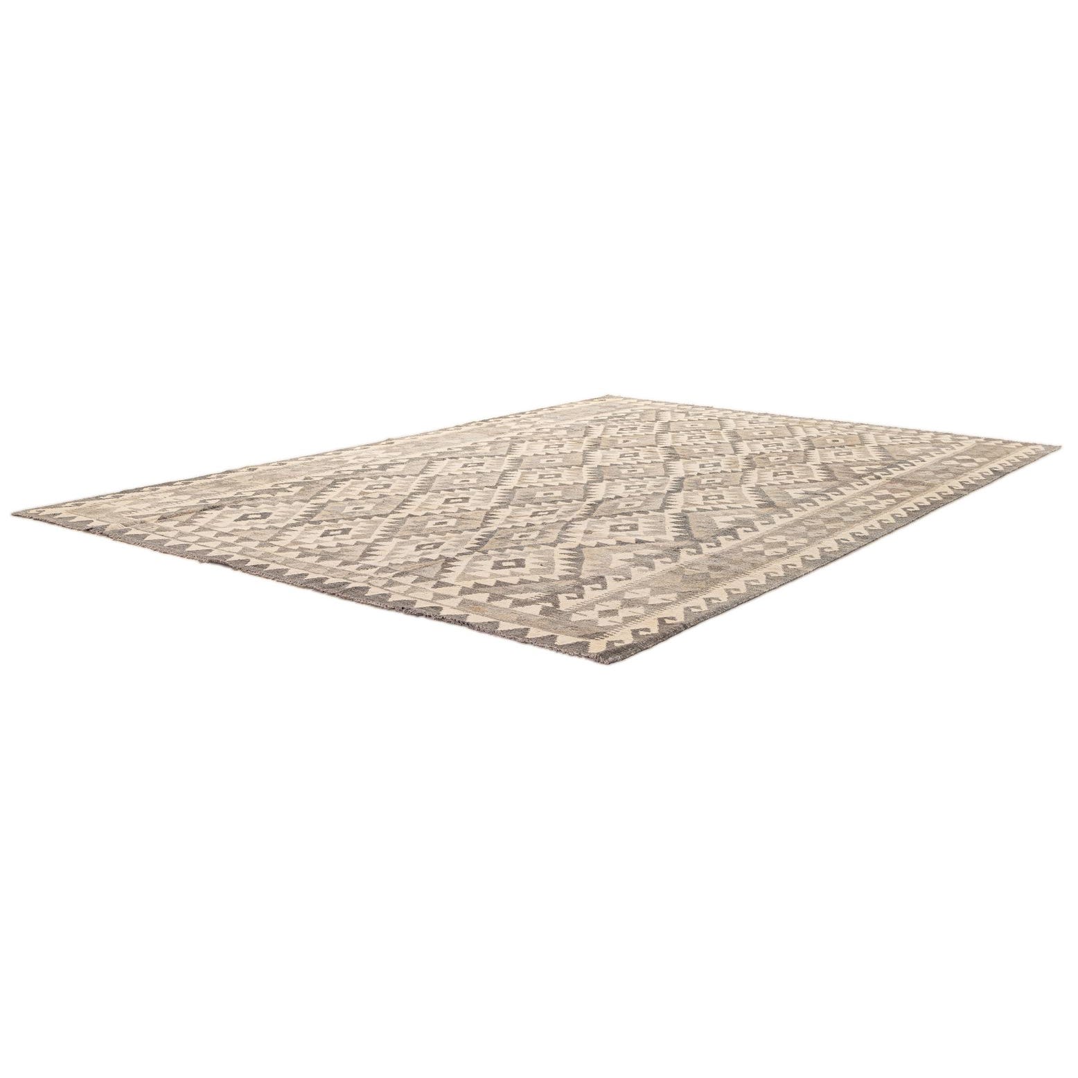 A 6x9 rectangular Kilim Maymana rug featuring a tribal geometric pattern in varying shades of gray and cream.