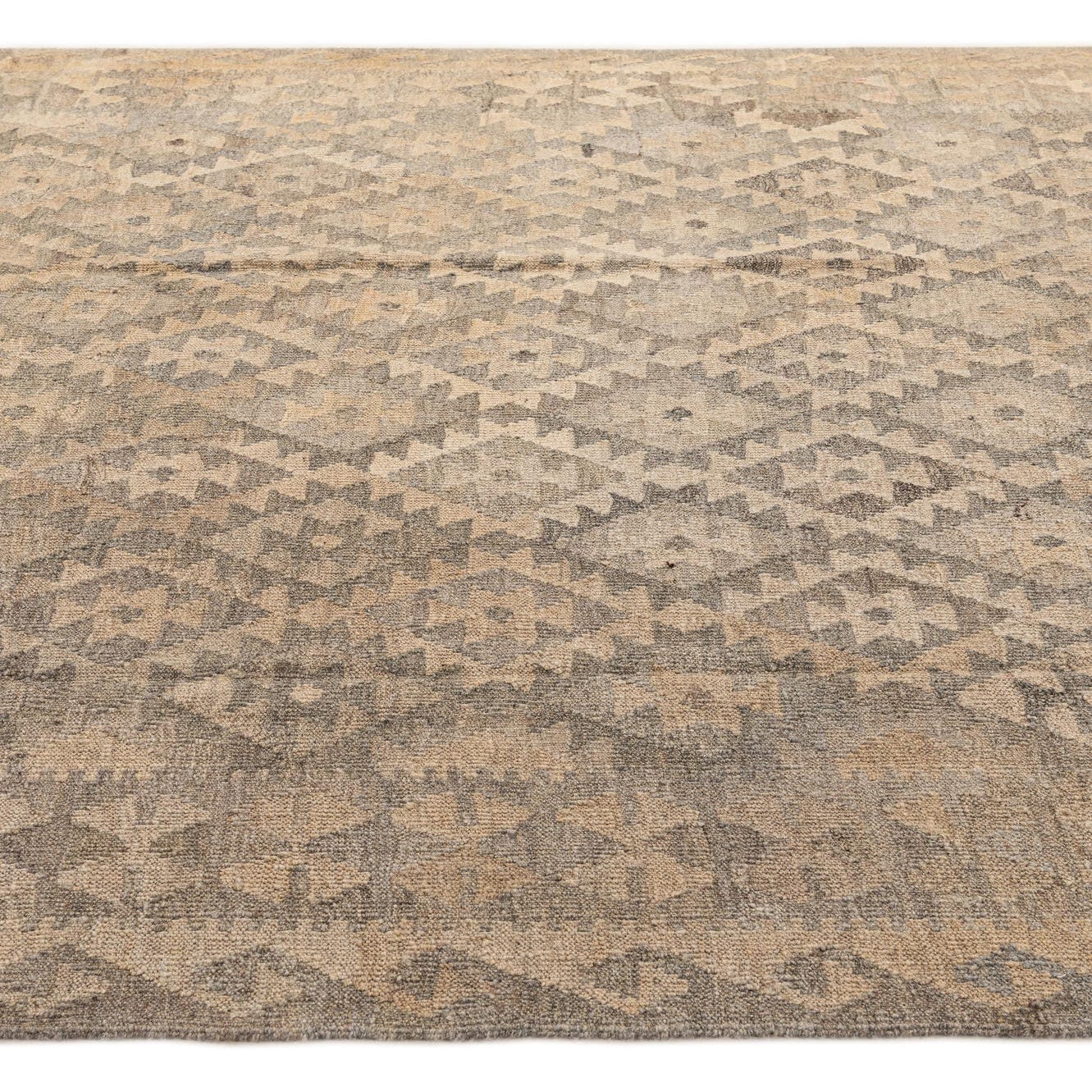 A 6x9 rectangular gray tribal flatweave wool rug with a repeating diamond pattern, ideal for a living room.